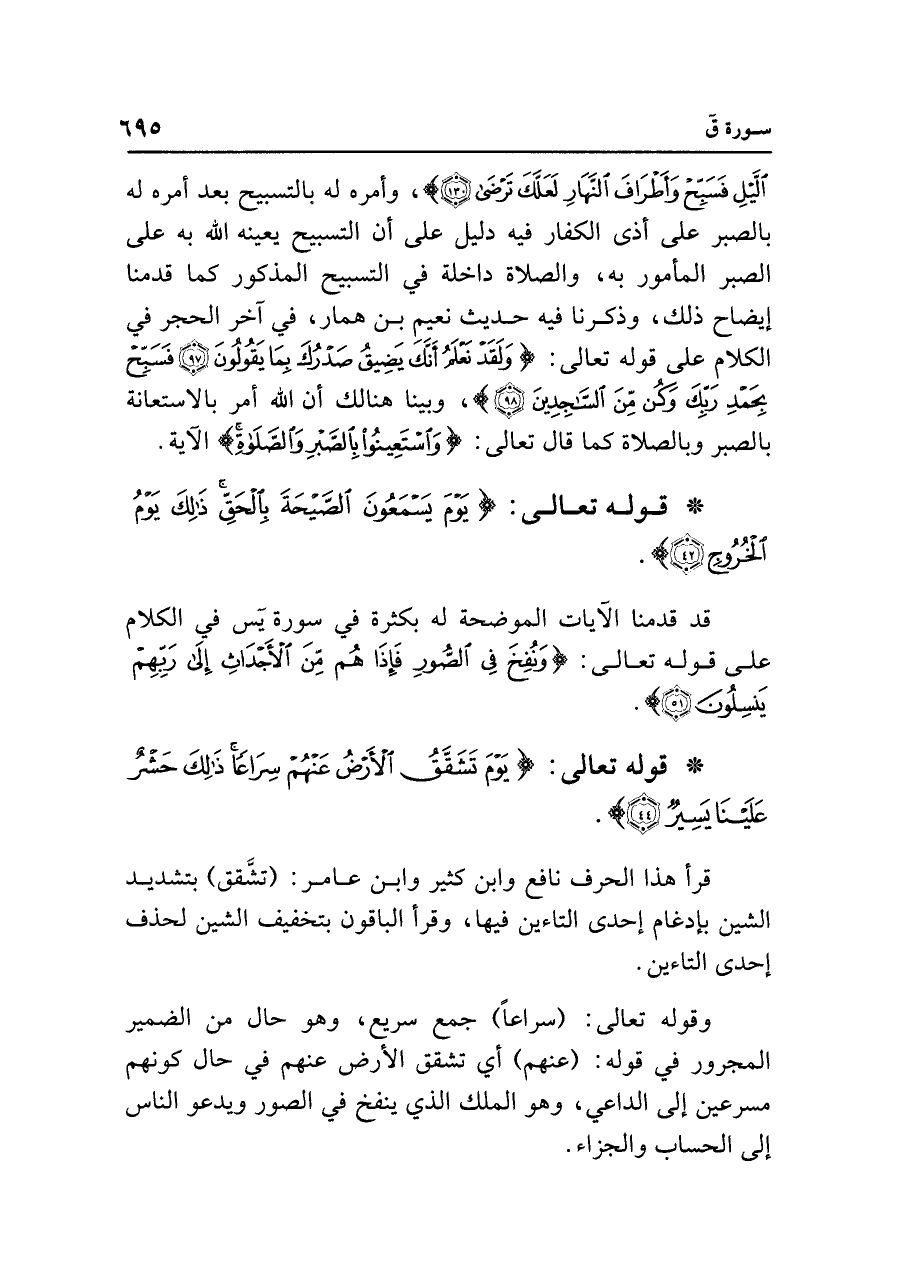 • قوله تعالى: {يَوْمَ تَشَقَّقُ الْأَرْضُ عَنْهُمْ سِرَاعًا ذَلِكَ حَشْرٌ عَلَينَا يَسِيرٌ (٤٤)}.
