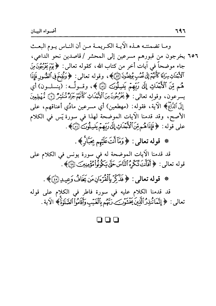وما تضمنته هذه الآية الكريمة من أن الناس يوم البعث يخرجون من قبورهم مسرعين إلى المحشر قاصدين نحو الداعي، جاء موضحًا في آيات أخر من كتاب الله، كقوه تعالى: {يَوْمَ يَخْرُجُونَ مِنَ الْأَجْدَاثِ سِرَاعًا كَأَنَّهُمْ إِلَى نُصُبٍ يُوفِضُونَ (٤٣)}، وقوله تعالى: {وَنُفِخَ فِي الصُّورِ فَإِذَا هُمْ مِنَ الْأَجْدَاثِ إِلَى رَبِّهِمْ يَنْسِلُونَ (٥١)}، وقوله: (ينسلون) أي يسرعون، وقوله تعالى: {يَخْرُجُونَ مِنَ الْأَجْدَاثِ كَأَنَّهُمْ جَرَادٌ مُنْتَشِرٌ (٧) مُهْطِعِينَ إِلَى الدَّاعِ} الآية، فقوله: (مهطعين) أي مسرعين مادي أعناقهم، على الأصح، وقد قدمنا الآيات الموضحة لهذا في سورة يس في الكلام على قوله: {وَنُفِخَ فِي الصُّورِ فَإِذَا هُمْ مِنَ الْأَجْدَاثِ إِلَى رَبِّهِمْ يَنْسِلُونَ (٥١)}.