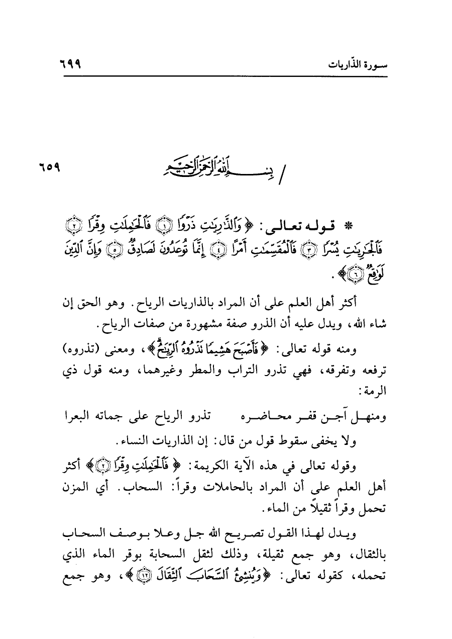 أكثر أهل العلم على أن المراد بالذاريات الرياح. وهو الحق إن شاء الله، ويدل عليه أن الذرو صفة مشهورة من صفات الرياح.