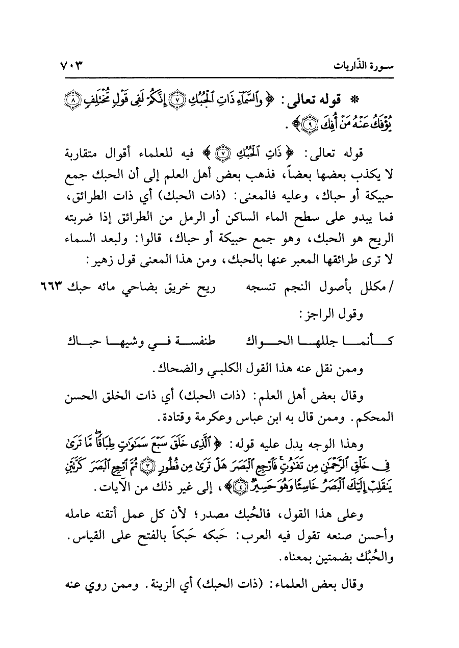 قوله تعالى: {ذَاتِ الْحُبُكِ} فيه للعلماء أقوال متقاربة لا يكذب بعضها بعضًا، فذهب بعض أهل العلم إلى أن الحبك جمع حبيكة أو حباك، وعليه فالمعنى: (ذات الحبك) أي ذات الطرائق، فما يبدو على سطح الماء الساكن أو الرمل من الطرائق إذا ضربته الريح هو الحبك، وهو جمع حبيكة أو حباك، قالوا: ولبعد السماء لا ترى طرائقها المعبر عنها بالحبك، ومن هذا المعنى قول زهير: