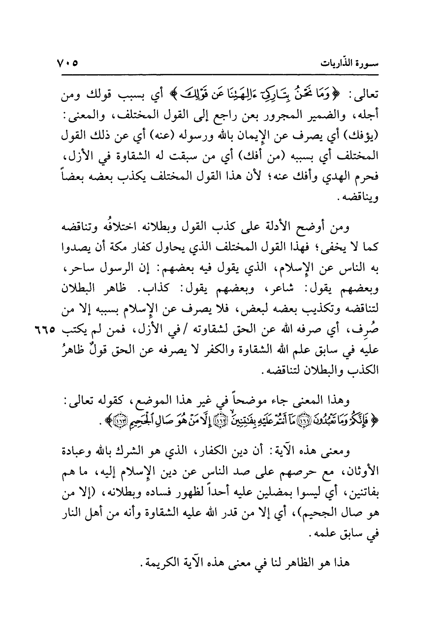 تعالى: {وَمَا نَحْنُ بِتَارِكِي آلِهَتِنَا عَنْ قَوْلِكَ} أي بسبب قولك ومن أجله، والضمير المجرور بعن راجع إلى القول المختلف، والمعنى: (يؤفك) أي يصرف عن الإيمان بالله ورسوله (عنه) أي عن ذلك القول المختلف أي بسببه (من أفك) أي من سبقت له الشقاوة في الأزل، فحرم الهدي وأفك عنه؛ لأن هذا القول المختلف يكذب بعضه بعضًا ويناقضه.