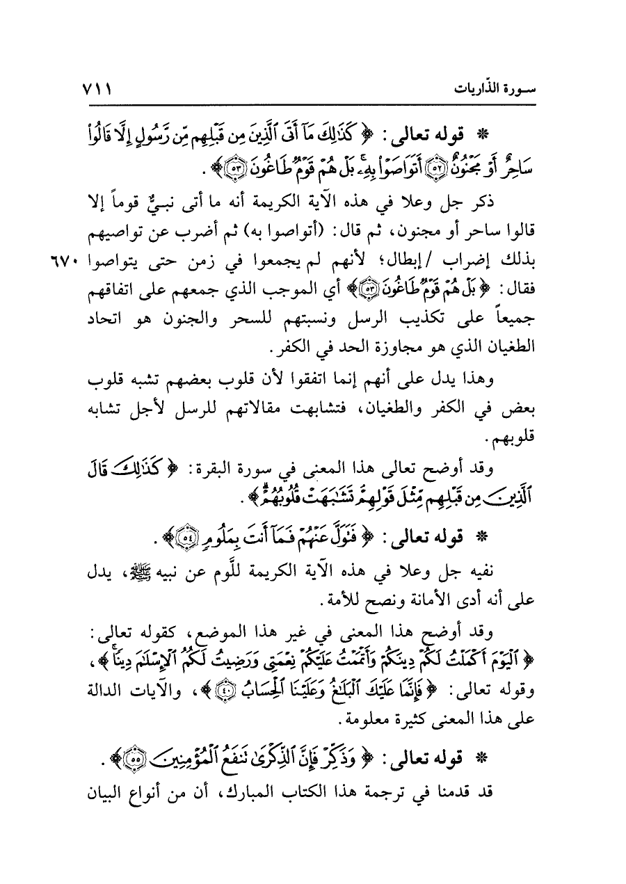 • قوله تعالى: {كَذَلِكَ مَا أَتَى الَّذِينَ مِنْ قَبْلِهِمْ مِنْ رَسُولٍ إلا قَالُوا سَاحِرٌ أَوْ مَجْنُونٌ (٥٢) أَتَوَاصَوْا بِهِ بَلْ هُمْ قَوْمٌ طَاغُونَ (٥٣)}.