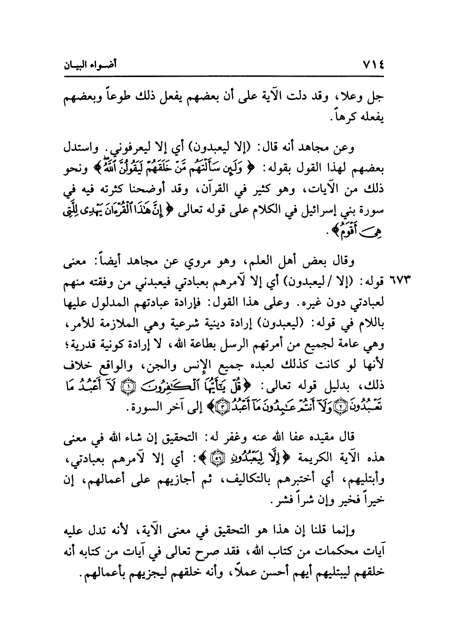 قال مقيده عفا الله عنه وغفر له: التحقيق إن شاء الله في معنى هذه الآية الكريمة {إلا لِيَعْبُدُونِ}: أي إلا لآمرهم بعبادتي، وأبتليهم، أي أختبرهم بالتكاليف، ثم أجازيهم على أعمالهم، إن خيرًا فخير وإن شرًّا فشر.