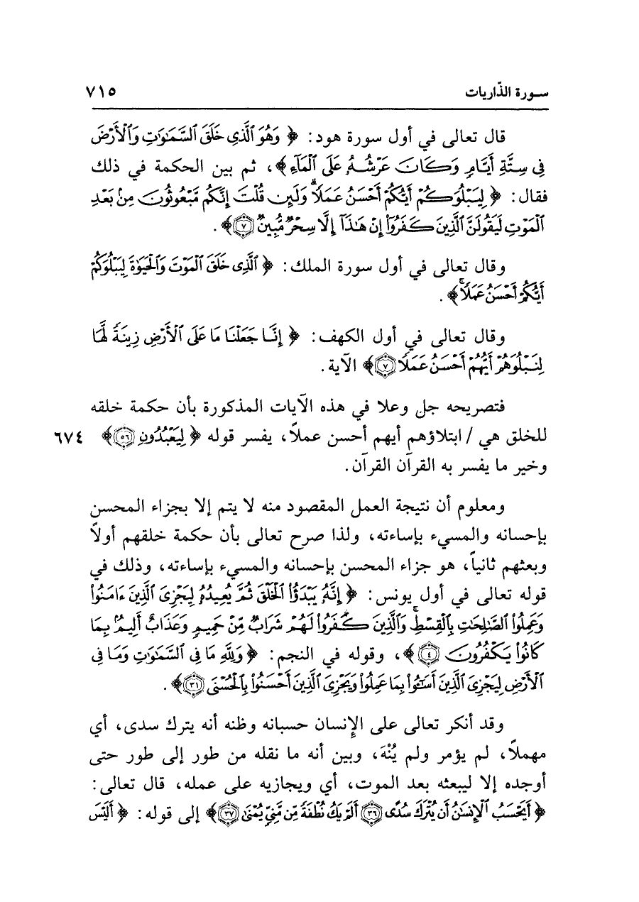 ومعلوم أن نتيجة العمل المقصود منه لا يتم إلا بجزاء المحسن بإحسانه والمسيء بإساءته، ولذا صرح تعالى بأن حكمة خلقهم أولًا وبعثهم ثانيًا، هو جزاء المحسن بإحسانه والمسيء بإساءته، وذلك في قوله تعالى في أول يونس: {إِنَّهُ يَبْدَأُ الْخَلْقَ ثُمَّ يُعِيدُهُ لِيَجْزِيَ الَّذِينَ آمَنُوا وَعَمِلُوا الصَّالِحَاتِ بِالْقِسْطِ وَالَّذِينَ كَفَرُوا لَهُمْ شَرَابٌ مِنْ حَمِيمٍ وَعَذَابٌ أَلِيمٌ بِمَا كَانُوا يَكْفُرُونَ (٤)}، وقوله في النجم: {وَلِلَّهِ مَا فِي السَّمَاوَاتِ وَمَا فِي الْأَرْضِ لِيَجْزِيَ الَّذِينَ أَسَاءُوا بِمَا عَمِلُوا وَيَجْزِيَ الَّذِينَ أَحْسَنُوا بِالْحُسْنَى (٣١)}.