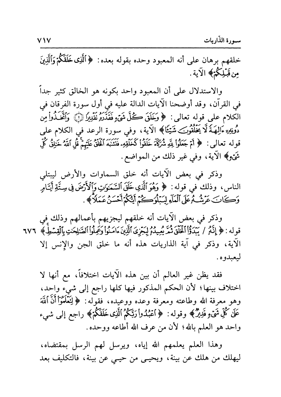 فقد يظن غير العالم أن بين هذه الآيات اختلافًا، مع أنها لا اختلاف بينها؛ لأن الحكم المذكور فيها كلها راجع إلى شيء واحد، وهو معرفة الله وطاعته ومعرفة وعده ووعيده، فقوله: {لِتَعْلَمُوا أَنَّ اللَّهَ عَلَى كُلِّ شَيءٍ قَدِيرٌ} قوله: {يَا أَيُّهَا النَّاسُ اتَّقُوا رَبَّكُمُ الَّذِي خَلَقَكُمْ} راجع إلى شيء واحد هو العلم بالله؛ لأن من عرف الله أطاعه ووحده.
