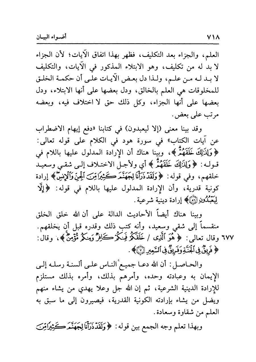 وقد بينا معنى (إلا يعبدون) في كتابنا "دفع إيهام الاضطراب عن آيات الكتاب" في سورة هود في الكلام على قوله تعالى: {وَلِذَلِكَ خَلَقَهُمْ}، وبينا هناك أن الإرادة المدلول عليها باللام في قوله: {وَلِذَلِكَ خَلَقَهُمْ} أي ولأجل الاختلاف إلى شقي وسعيد خلقهم، وفي قوله: {وَلَقَدْ ذَرَأْنَا لِجَهَنَّمَ كَثِيرًا مِنَ الْجِنِّ وَالْإِنْسِ} إرادة كونية قدرية، وأن الإرادة المدلول عليها باللام في قوله: {إلا لِيَعْبُدُونِ (٥٦)} إرادة دينية شرعية.