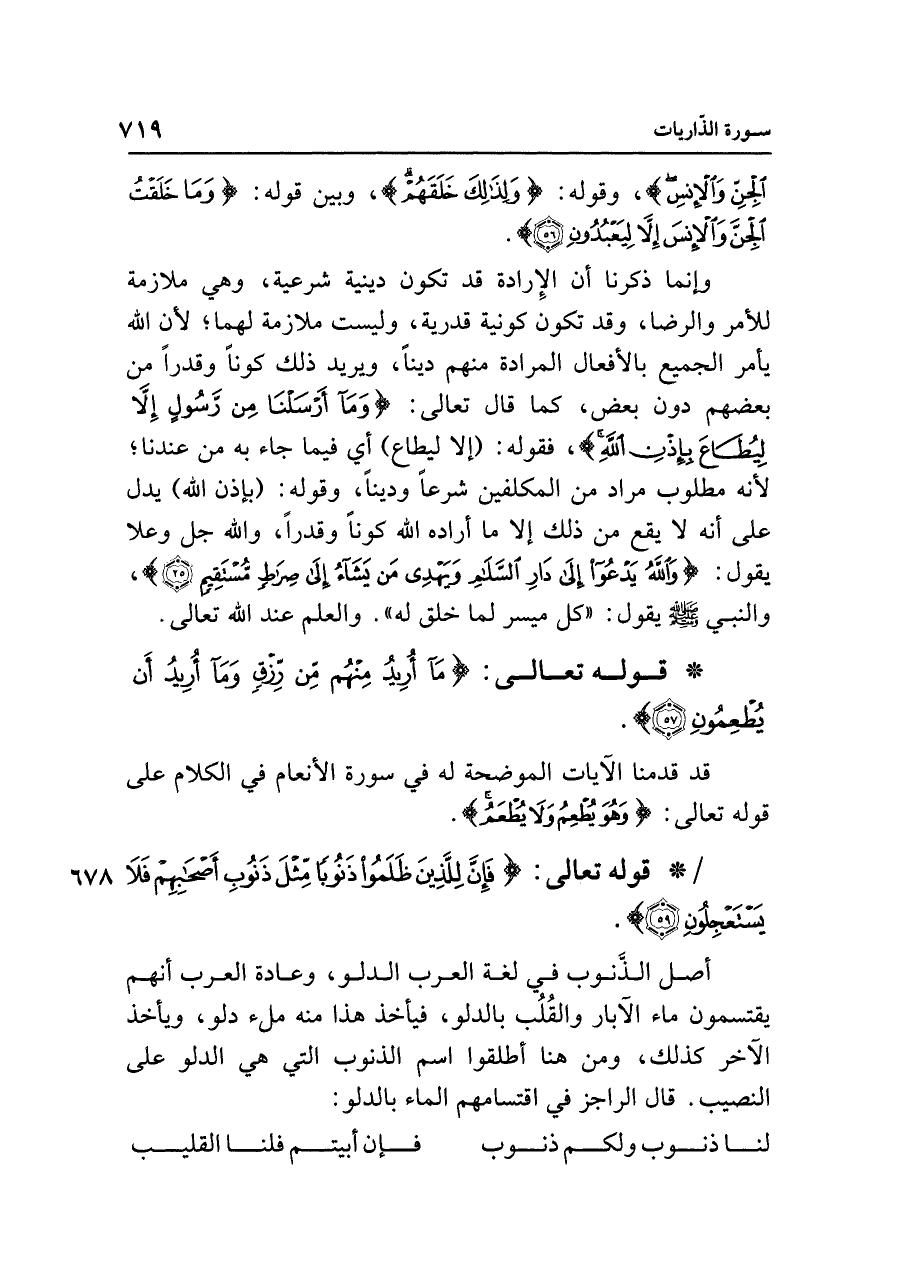 وإنما ذكرنا أن الإرادة قد تكون دينية شرعية، وهي ملازمة للأمر والرضا، وقد تكون كونية قدرية، وليست ملازمة لهما؛ لأن الله يأمر الجميع بالأفعال المرادة منهم دينا، ويريد ذلك كونًا وقدرًا من بعضهم دون بعض، كما قال تعالى: {وَمَا أَرْسَلْنَا مِنْ رَسُولٍ إلا لِيُطَاعَ بِإِذْنِ اللَّهِ}، فقوله: (إلا ليطاع) أي فيما جاء به من عندنا؛ لأنه مطلوب مراد من المكلفين شرعًا ودينًا، وقوله: (بإذن الله) يدل على أنه لا يقع من دلك إلا ما أراده الله كونًا وقدرًا، والله جل وعلا يقول: {وَاللَّهُ يَدْعُو إِلَى دَارِ السَّلَامِ وَيَهْدِي مَنْ يَشَاءُ إِلَى صِرَاطٍ مُسْتَقِيمٍ (٢٥)}، والنبي - صلى الله عليه وسلم - يقول: "كل ميسر لما خلق له". والعلم عند الله تعالى.