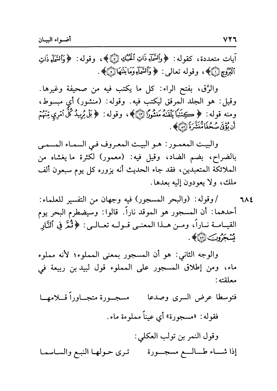 وقوله: (والبحر المسجور) فيه وجهان من التفسير للعلماء: أحدهما: أن المسجور هو الموقد نارًا. قالوا: وسيضطرم البحر يوم القيامة نارًا، ومن هذا المعنى قوله تعالى: {فِي الْحَمِيمِ ثُمَّ فِي النَّارِ يُسْجَرُونَ (٧٢)}.