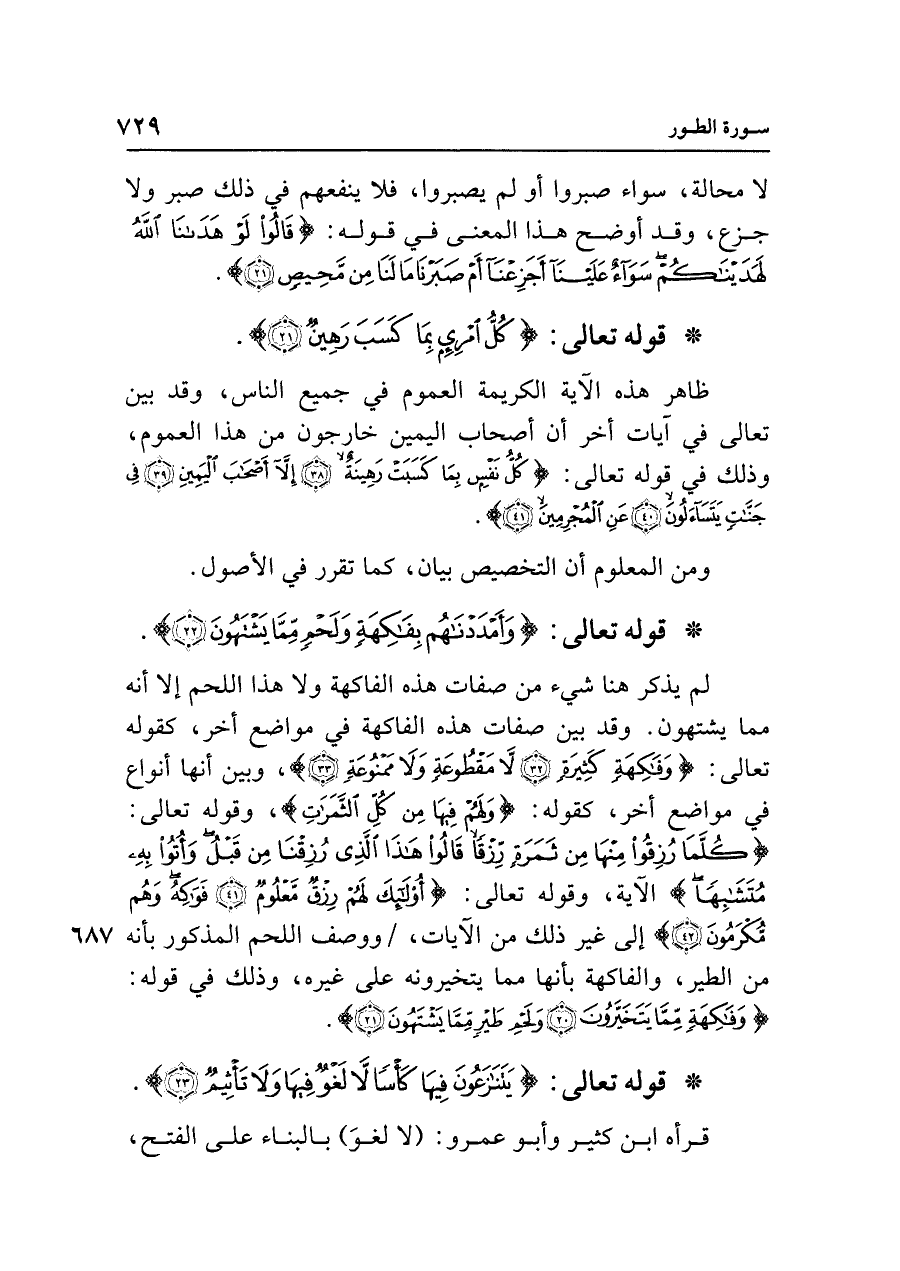 لم يذكر هنا شيء من صفات هذه الفاكهة ولا هذا اللحم إلَّا أنَّه مما يشتهون. وقد بين صفات هذه الفاكهة في مواضع أخر، كقوله تعالى: {وَفَاكِهَةٍ كَثِيرَةٍ (٣٢) لَا مَقْطُوعَةٍ وَلَا مَمْنُوعَةٍ (٣٣)}، وبين أنَّها أنواع في مواضع أخر، كقوله: {وَلَهُمْ فِيهَا مِنْ كُلِّ الثَّمَرَاتِ}، وقوله تعالى: {كُلَّمَا رُزِقُوا مِنْهَا مِنْ ثَمَرَةٍ رِزْقًا قَالُوا هَذَا الَّذِي رُزِقْنَا مِنْ قَبْلُ وَأُتُوا بِهِ مُتَشَابِهًا} الآية، وقوله تعالى: {أُولَئِكَ لَهُمْ رِزْقٌ مَعْلُومٌ (٤١) فَوَاكِهُ وَهُمْ مُكْرَمُونَ (٤٢)} إلى غير ذلك من الآيات، ووصف اللحم المذكور بأنه من الطير، والفاكهة بأنها مما يتخيرونه على غيره، وذلك في قوله: {وَفَاكِهَةٍ مِمَّا يَتَخَيَّرُونَ (٢٠) وَلَحْمِ طَيرٍ مِمَّا يَشْتَهُونَ (٢١)}.