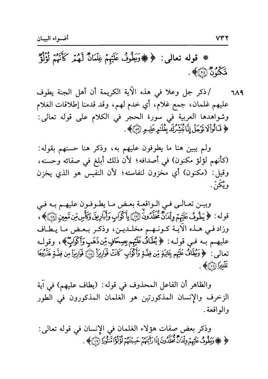 ذكر جل وعلا في هذه الآية الكريمة أن أهل الجنَّةَ يطوف عليهم غلمان، جمع غلام، أي خدم لهم، وقد قدمنا إطلاقات الغلام وشواهدها العربية في سورة الحجر في الكلام على قوله تعالى: {قَالُوا لَا تَوْجَلْ إِنَّا نُبَشِّرُكَ بِغُلَامٍ عَلِيمٍ (٥٣)}.