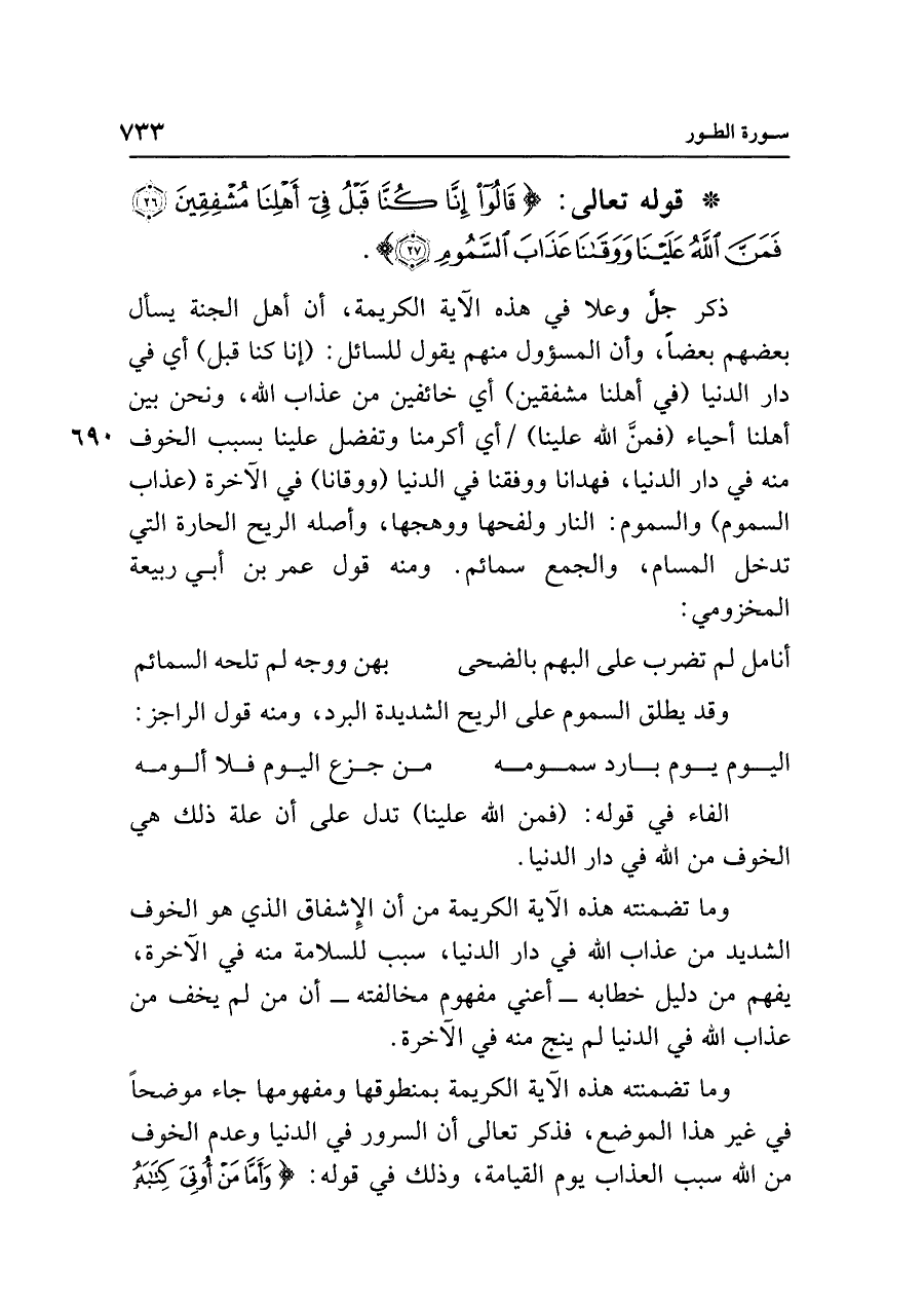 ذكر جلا وعلا في هذه الآية الكريمة، أن أهل الجنَّةِ يسأل بعضهم بعضًا، وأن المسؤول منهم يقول للسائل: (إنا كنا قبل) أي في دار الدنيا (في أهلنا مشفقين) أي خائفين من عذاب الله، ونحن بين أهلنا أحياء (فمنَّ الله علينا) أي أكرمنا وتفضل علينا بسبب الخوف منه في دار الدنيا، فهدانا ووفقنا في الدنيا (ووقانا) في الآخرة (عذاب السموم) والسموم: النار ولفحها ووهجها، وأصله الريح الحارة التي تدخل المسام، والجمع سمائم. ومنه قول عمر بن أبي ربيعة المخزومي: