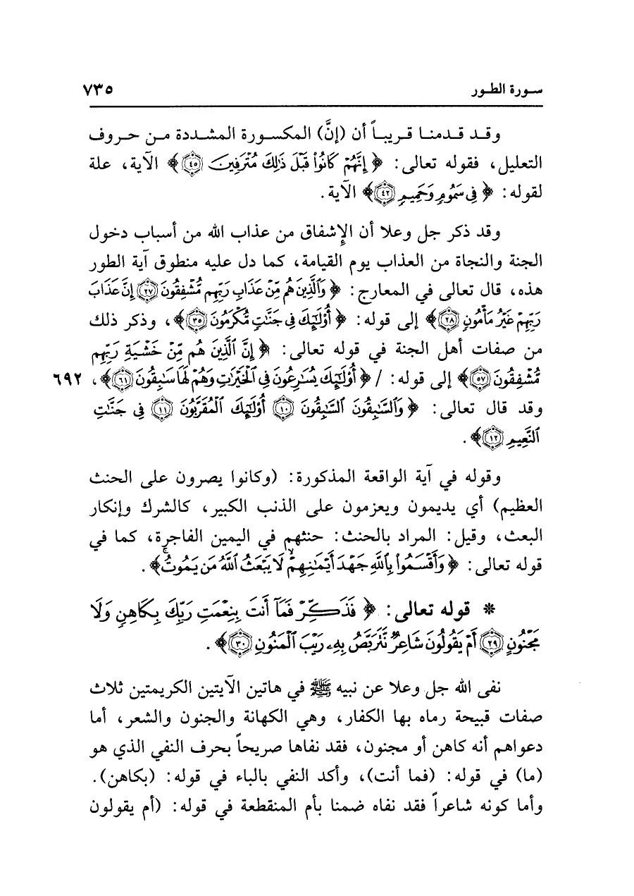 • قوله تعالى: {فَذَكِّرْ فَمَا أَنْتَ بِنِعْمَتِ رَبِّكَ بِكَاهِنٍ وَلَا مَجْنُونٍ (٢٩) أَمْ يَقُولُونَ شَاعِرٌ نَتَرَبَّصُ بِهِ رَيبَ الْمَنُونِ (٣٠)}.