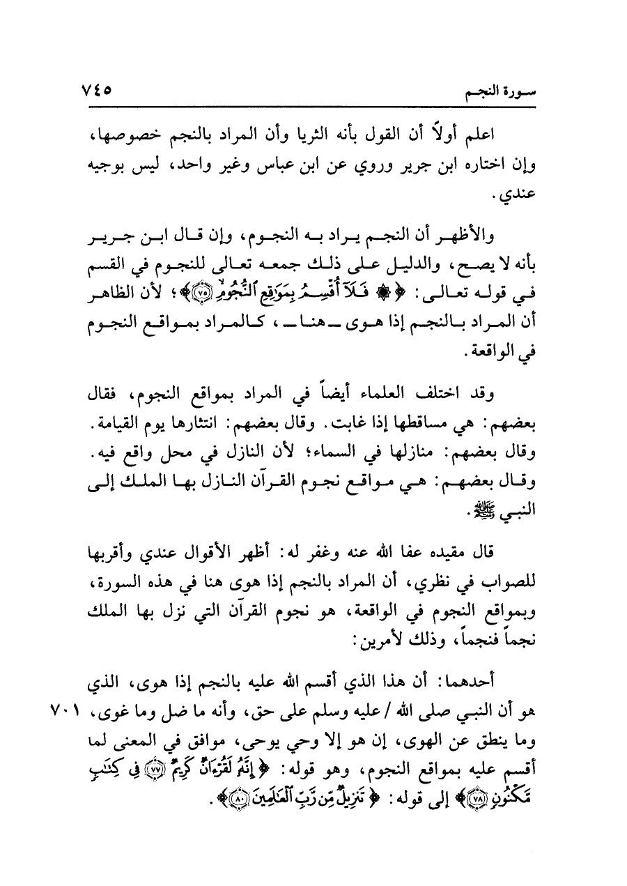 قال مقيده عفا الله عنه وغفر له: أظهر الأقوال عندي وأقربها للصواب في نظري، أن المراد بالنجم إذا هوى هنا في هذه السورة، وبمواقع النجوم في الواقعة، هو نجوم القرآن التي نزل بها الملك نجمًا فنجمًا، وذلك لأمرين.