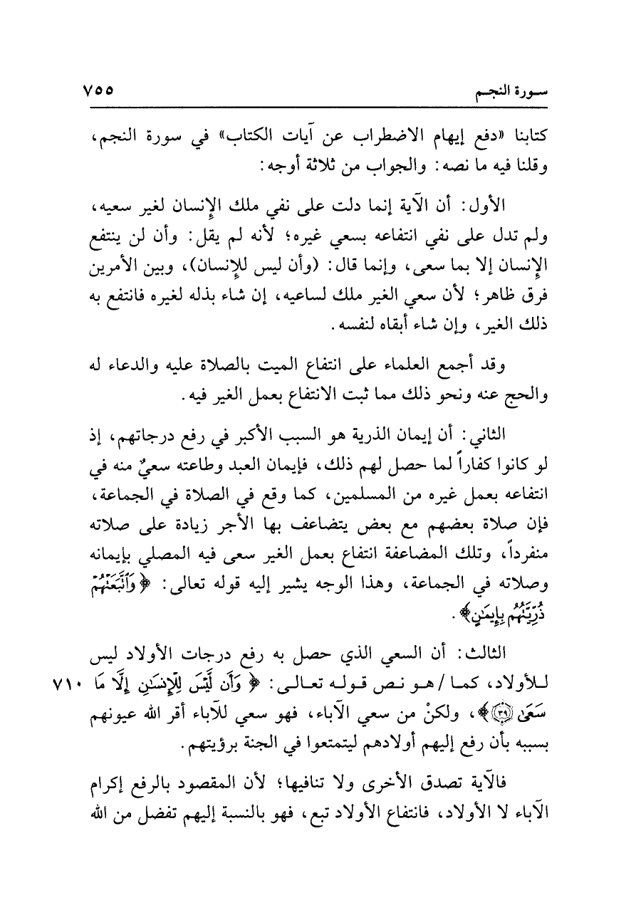 الثالث: أن السعي الذي حصل به رفع درجات الأولاد ليس للأولاد، كما هو نص قوله تعالى: {وَأَنْ لَيسَ لِلْإِنْسَانِ إلا مَا سَعَى (٣٩)}، ولكن من سعي الآباء، فهو سعي للآباء أقر الله عيونهم بسببه بأن رفع إليهم أولادهم ليتمتعوا في الجنَّة برؤيتهم.