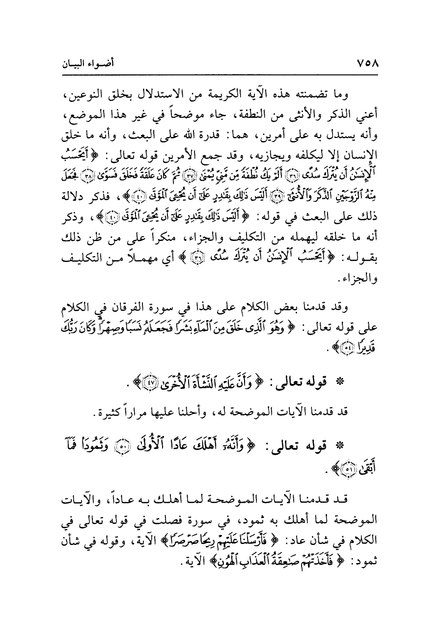 وما تضمنته هذه الآية الكريمة من الاستدلال بخلق النوعين، أعني الذكر والأنثى من النطفة، جاء موضحًا في غير هذا الموضع، وأنه يستدل به على أمرين، هما: قدرة الله على البعث، وأنه ما خلق الإنسان إلَّا ليكلفه ويجازيه، وقد جمع الأمرين قوله تعالى: {أَيَحْسَبُ الْإِنْسَانُ أَنْ يُتْرَكَ سُدًى (٣٦) أَلَمْ يَكُ نُطْفَةً مِنْ مَنِيٍّ يُمْنَى (٣٧) ثُمَّ كَانَ عَلَقَةً فَخَلَقَ فَسَوَّى (٣٨) فَجَعَلَ مِنْهُ الزَّوْجَينِ الذَّكَرَ وَالْأُنْثَى (٣٩) أَلَيسَ ذَلِكَ بِقَادِرٍ عَلَى أَنْ يُحْيِيَ الْمَوْتَى (٤٠)}، فذكر دلالة ذلك على البعث في قوله: {أَلَيسَ ذَلِكَ بِقَادِرٍ عَلَى أَنْ يُحْيِيَ الْمَوْتَى (٤٠)}، وذكر أنه ما خلقه ليهمله من التكليف والجزاء، منكرًا على من ظن ذلك بقوله: {أَيَحْسَبُ الْإِنْسَانُ أَنْ يُتْرَكَ سُدًى (٣٦)} أي مهملًا من التكليف والجزاء.
