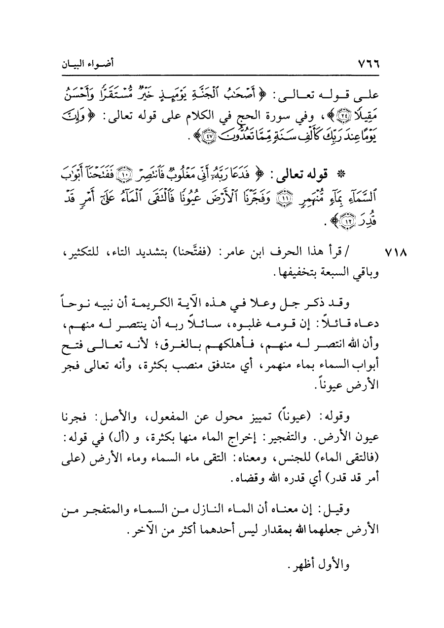 وقد ذكر جلا وعلا في هذه الآية الكريمة أن نبيه نوحًا دعاه قائلًا: إن قومه غلبوه، سائلًا ربه أن ينتصر له منهم، وأن الله انتصر له منهم، فأهلكهم بالغرق؛ لأنه تعالى فتح أَبواب السماء بماء منهمر، أي متدفق منصب بكثرة، وأنه تعالى فجر الأرض عيونًا.