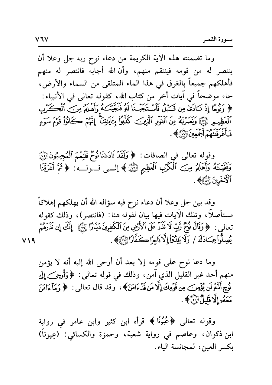 وما تضمنته هذه الآية الكريمة من دعاء نوح ربه جل وعلا أن ينتصر له من قومه فينتقم منهم، وأن الله أجابه فانتصر له منهم فأهلكهم جميعًا بالغرق في هذا الماء المتلقى من السماء والأرض، جاء موضحًا في آيات أخر من كتاب الله، كقوله تعالى في الأنبياء: {وَنُوحًا إِذْ نَادَى مِنْ قَبْلُ فَاسْتَجَبْنَا لَهُ فَنَجَّينَاهُ وَأَهْلَهُ مِنَ الْكَرْبِ الْعَظِيمِ (٧٦) وَنَصَرْنَاهُ مِنَ الْقَوْمِ الَّذِينَ كَذَّبُوا بِآيَاتِنَا إِنَّهُمْ كَانُوا قَوْمَ سَوْءٍ فَأَغْرَقْنَاهُمْ أَجْمَعِينَ (٧٧)}.