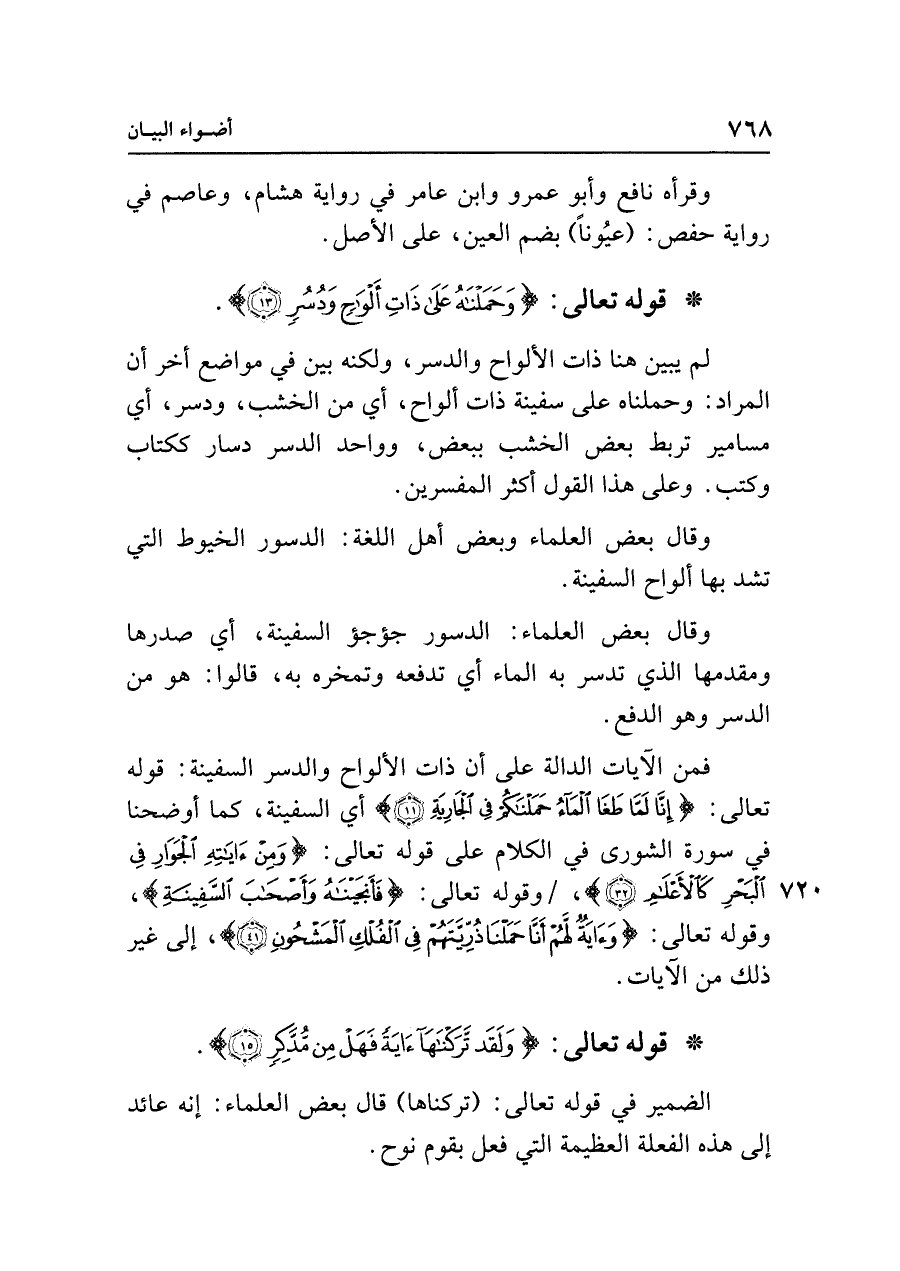 • قوله تعالى: {وَحَمَلْنَاهُ عَلَى ذَاتِ أَلْوَاحٍ وَدُسُرٍ (١٣)}.