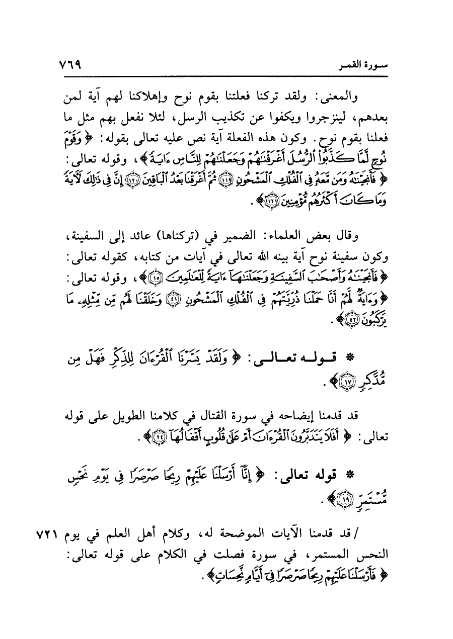 وقال بعض العلماء: الضمير في (تركناها) عائد إلى السفينة، وكون سفينة نوح آية بينه الله تعالى في آيات من كتابه، كقوله تعالى: {فَأَنْجَينَاهُ وَأَصْحَابَ السَّفِينَةِ وَجَعَلْنَاهَا آيَةً لِلْعَالمِينَ (١٥)}، وقوله تعالى: {وَآيَةٌ لَهُمْ أَنَّا حَمَلْنَا ذُرِّيَّتَهُمْ فِي الْفُلْكِ الْمَشْحُونِ (٤١) وَخَلَقْنَا لَهُمْ مِنْ مِثْلِهِ مَا يَرْكَبُونَ (٤٢)}.