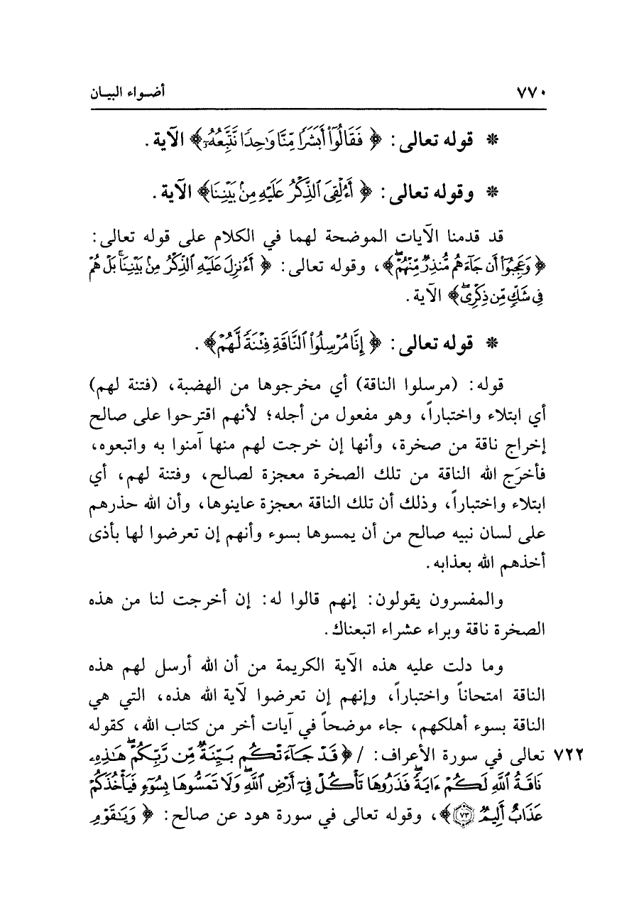 وما دلت عليه هذه الآية الكريمة من أن الله أرسل لهم هذه الناقة امتحانًا واختبارًا، وإنهم إن تعرضوا لآية الله هذه، التي هي الناقة بسوء أهلكهم، جاء موضحًا في آيات أخر من كتاب الله، كقوله تعالى في سورة الأعراف: {قَدْ جَاءَتْكُمْ بَيِّنَةٌ مِنْ رَبِّكُمْ هَذِهِ نَاقَةُ اللَّهِ لَكُمْ آيَةً فَذَرُوهَا تَأْكُلْ فِي أَرْضِ اللَّهِ وَلَا تَمَسُّوهَا بِسُوءٍ فَيَأْخُذَكُمْ عَذَابٌ أَلِيمٌ (٧٣)}، وقوله تعالى في سورة هود عن صالح: {وَيَاقَوْمِ