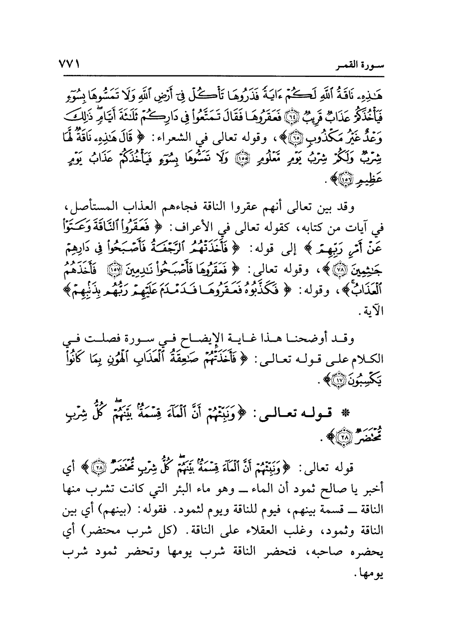 قوله تعالى: {وَنَبِّئْهُمْ أَنَّ الْمَاءَ قِسْمَةٌ بَينَهُمْ كُلُّ شِرْبٍ مُحْتَضَرٌ (٢٨)} أي أخبر يا صالح ثمود أن الماء - وهو ماء البئر التي كانت تشرب منها الناقة - قسمة بينهم، فيوم للناقة ويوم لثمود. فقوله: (بينهم) أي بين الناقة وثمود، وغلب العقلاء على الناقة. (كل شرب محتضر) أي يحضره صاحبه، فتحضر الناقة شرب يومها وتحضر ثمود شرب يومها.