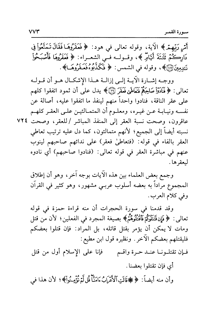أَمْرِ رَبِّهِمْ} الآية وقوله تعالى في هود: {فَعَقَرُوهَا فَقَال تَمَتَّعُوا فِي دَارِكُمْ ثَلَاثَةَ أَيَّامٍ}، وقوله في الشعراء: {فَعَقَرُوهَا فَأَصْبَحُوا نَادِمِينَ (١٥٧)}، وقوله في الشمس: {فَكَذَّبُوهُ فَعَقَرُوهَا}.