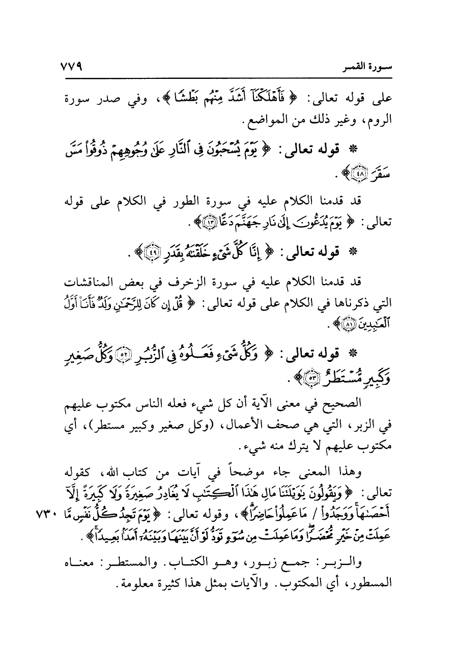 • قوله تعالى: {وَكُلُّ شَيءٍ فَعَلُوهُ فِي الزُّبُرِ (٥٢) وَكُلُّ صَغِيرٍ وَكَبِيرٍ مُسْتَطَرٌ (٥٣)}: