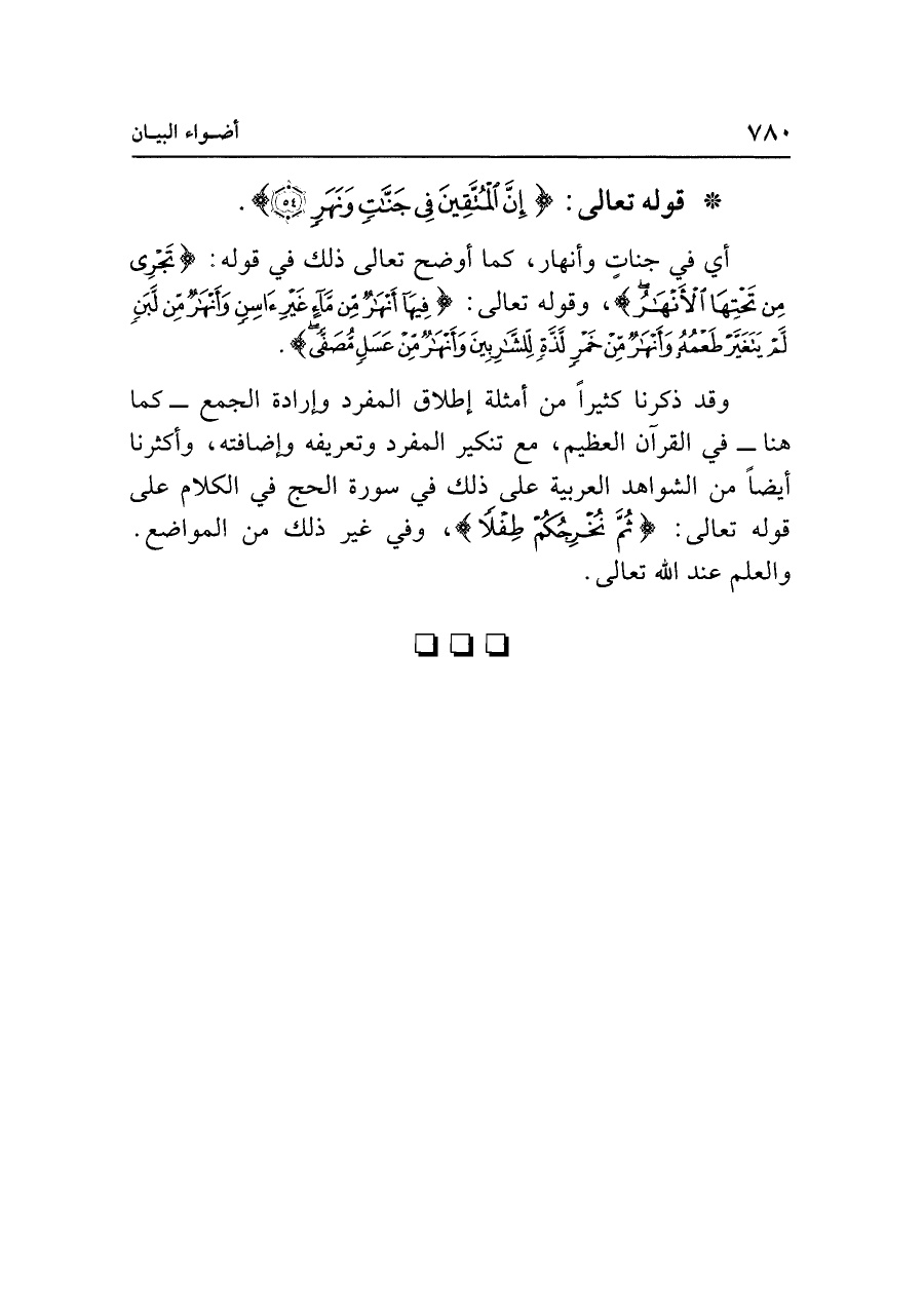 • قوله تعالى: {إِنَّ الْمُتَّقِينَ فِي جَنَّاتٍ وَنَهَرٍ (٥٤)}.