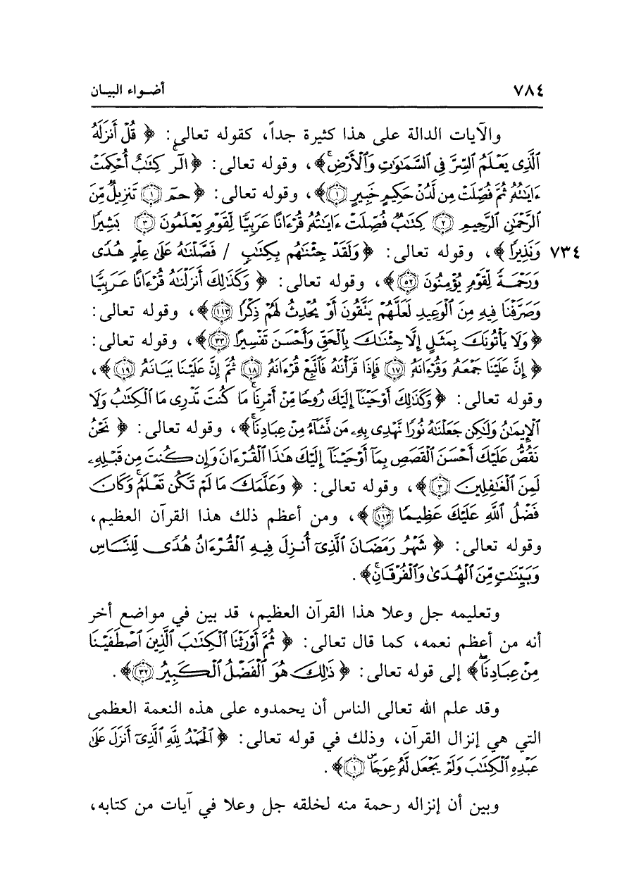 والآيات الدالة على هذا كثيرة جدًّا، كقوله تعالى: {قُلْ أَنْزَلَهُ الَّذِي يَعْلَمُ السِّرَّ فِي السَّمَاوَاتِ وَالْأَرْضِ}، وقوله تعالى: {الر كِتَابٌ أُحْكِمَتْ آيَاتُهُ ثُمَّ فُصِّلَتْ مِنْ لَدُنْ حَكِيمٍ خَبِيرٍ (١)}، وقوله تعالى: {حم (١) تَنْزِيلٌ مِنَ الرَّحْمَنِ الرَّحِيمِ (٢) كِتَابٌ فُصِّلَتْ آيَاتُهُ قُرْآنًا عَرَبِيًّا لِقَوْمٍ يَعْلَمُونَ (٣) بَشِيرًا وَنَذِيرًا}، وقوله تعالى: {وَلَقَدْ جِئْنَاهُمْ بِكِتَابٍ فَصَّلْنَاهُ عَلَى عِلْمٍ هُدًى وَرَحْمَةً لِقَوْمٍ يُؤْمِنُونَ (٥٢)}، وقوله تعالى: {وَكَذَلِكَ أَنْزَلْنَاهُ قُرْآنًا عَرَبِيًّا وَصَرَّفْنَا فِيهِ مِنَ الْوَعِيدِ لَعَلَّهُمْ يَتَّقُونَ أَوْ يُحْدِثُ لَهُمْ ذِكْرًا (١١٣)}، وقوله تعالى: {وَلَا يَأْتُونَكَ بِمَثَلٍ إلا جِئْنَاكَ بِالْحَقِّ وَأَحْسَنَ تَفْسِيرًا (٣٣)}، وقوله تعالى: {إِنَّ عَلَينَا جَمْعَهُ وَقُرْآنَهُ (١٧) فَإِذَا قَرَأْنَاهُ فَاتَّبِعْ قُرْآنَهُ (١٨) ثُمَّ إِنَّ عَلَينَا بَيَانَهُ (١٩)}، وقوله تعالى: {نَحْنُ نَقُصُّ عَلَيكَ أَحْسَنَ الْقَصَصِ بِمَا أَوْحَينَا إِلَيكَ هَذَا الْقُرْآنَ وَإِنْ كُنْتَ مِنْ قَبْلِهِ لَمِنَ الْغَافِلِينَ (٣)}، وقوله تعالى: وقوله تعالى: {وَعَلَّمَكَ مَا لَمْ تَكُنْ تَعْلَمُ وَكَانَ فَضْلُ اللَّهِ عَلَيكَ عَظِيمًا (١١٣)}، ومن أعظم ذلك هذا القرآن العظيم، وقوله تعالى: {شَهْرُ رَمَضَانَ الَّذِي أُنْزِلَ فِيهِ الْقُرْآنُ هُدًى لِلنَّاسِ وَبَيِّنَاتٍ مِنَ الْهُدَى وَالْفُرْقَانِ}.
