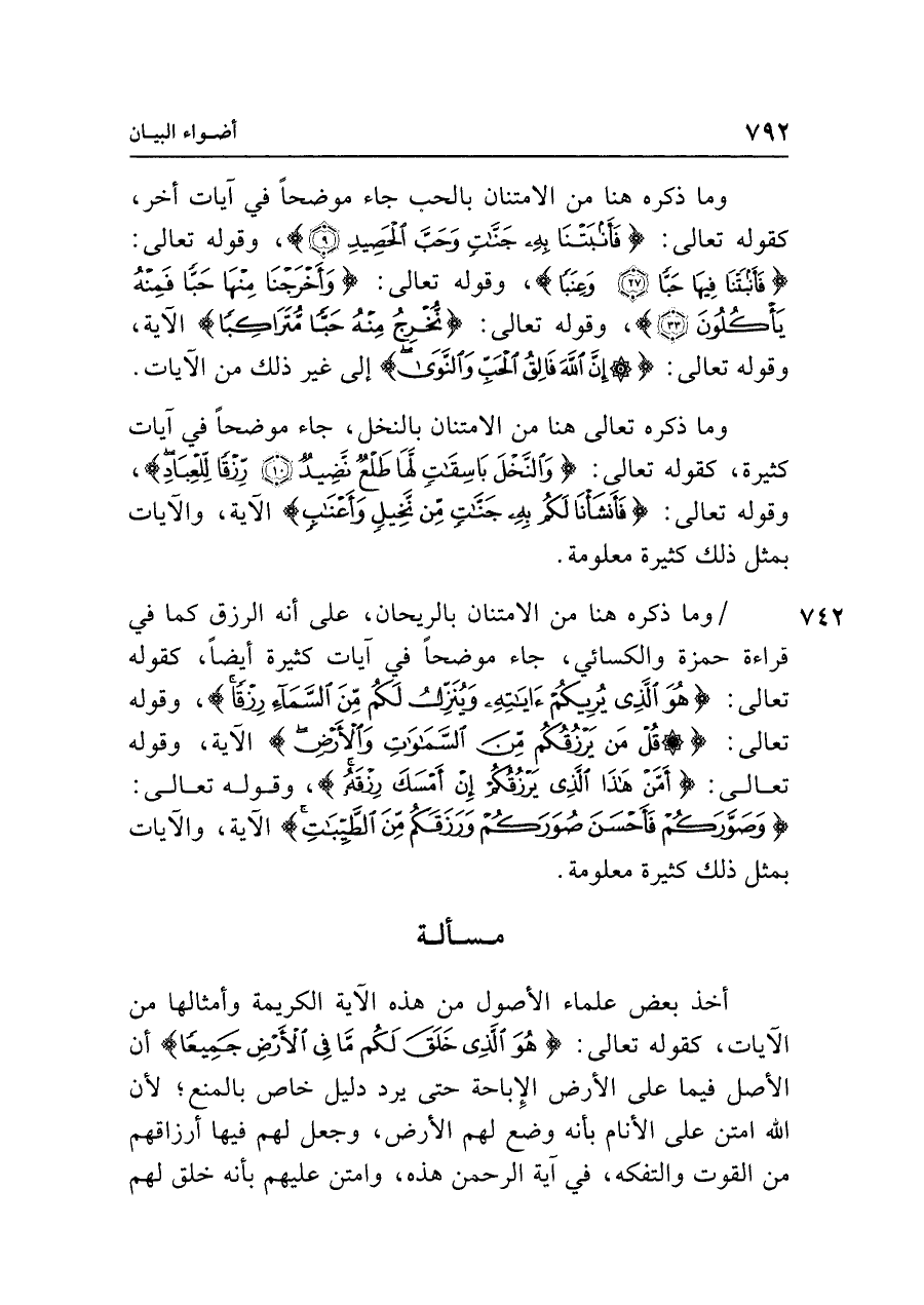 أخذ بعض علماء الأصول من هذه الآية الكريمة وأمثالها من الآيات، كقوله تعالى: {هُوَ الَّذِي خَلَقَ لَكُمْ مَا فِي الْأَرْضِ جَمِيعًا} أن الأصل فيما على الأرض الإباحة حتى يرد دليل خاص بالمنع؛ لأن الله امتن على الأنام بأنه وضع لهم الأرض، وجعل لهم فيها أرزاقهم من القوت والتفكه، في آية الرحمن هذه، وامتن عليهم بأنه خلق لهم