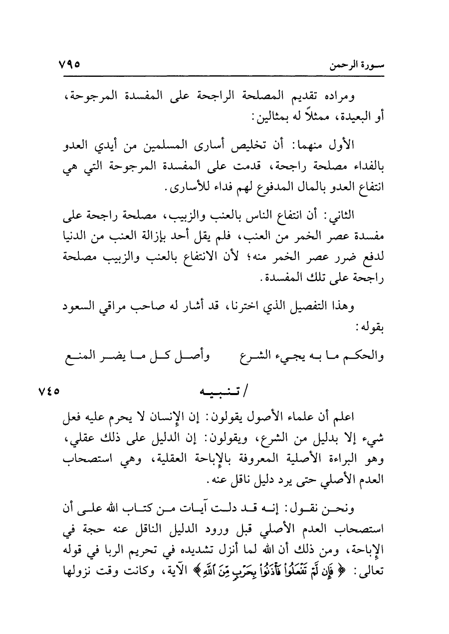 ونحن نقول: إنه قد دلت آيات من كتاب الله على أن استصحاب العدم الأصلي قبل ورود الدليل الناقل عنه حجة في الإباحة، ومن ذلك أن الله لما أنزل تشديده في تحريم الربا في قوله تعالى: {فَإِنْ لَمْ تَفْعَلُوا فَأْذَنُوا بِحَرْبٍ مِنَ اللَّهِ} الآية، وكانت وقت نزولها