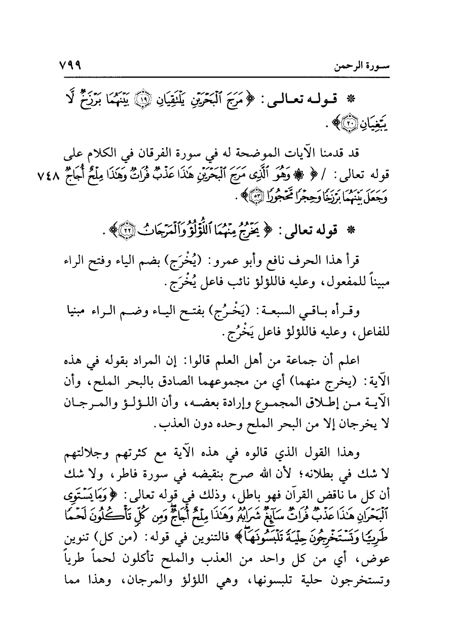 أعلم أن جماعة من أهل العلم قالوا: إن المراد بقوله في هذه الآية: (يخرج منهما) أي من مجموعهما الصادق بالبحر الملح، وأن الآية من إطلاق المجموع وإرادة بعضه، وأن اللؤلؤ والمرجان لا يخرجان إلا من البحر الملح وحده دون العذب.