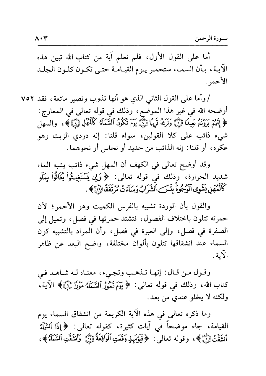 وأما على القول الثاني الذي هو أنها تذوب وتصير مائعة، فقد أوضحه الله في غير هذا الموضع، وذلك في قوله تعالى في المعارج: {إِنَّهُمْ يَرَوْنَهُ بَعِيدًا (٦) وَنَرَاهُ قَرِيبًا (٧) يَوْمَ تَكُونُ السَّمَاءُ كَالْمُهْلِ (٨)}، والمهل شيء ذائب على كلا القولين، سواء قلنا: إنه دردي الزيت وهو عكره، أو قلنا: إنه الذائب من حديد أو نحاس أو نحوهما.