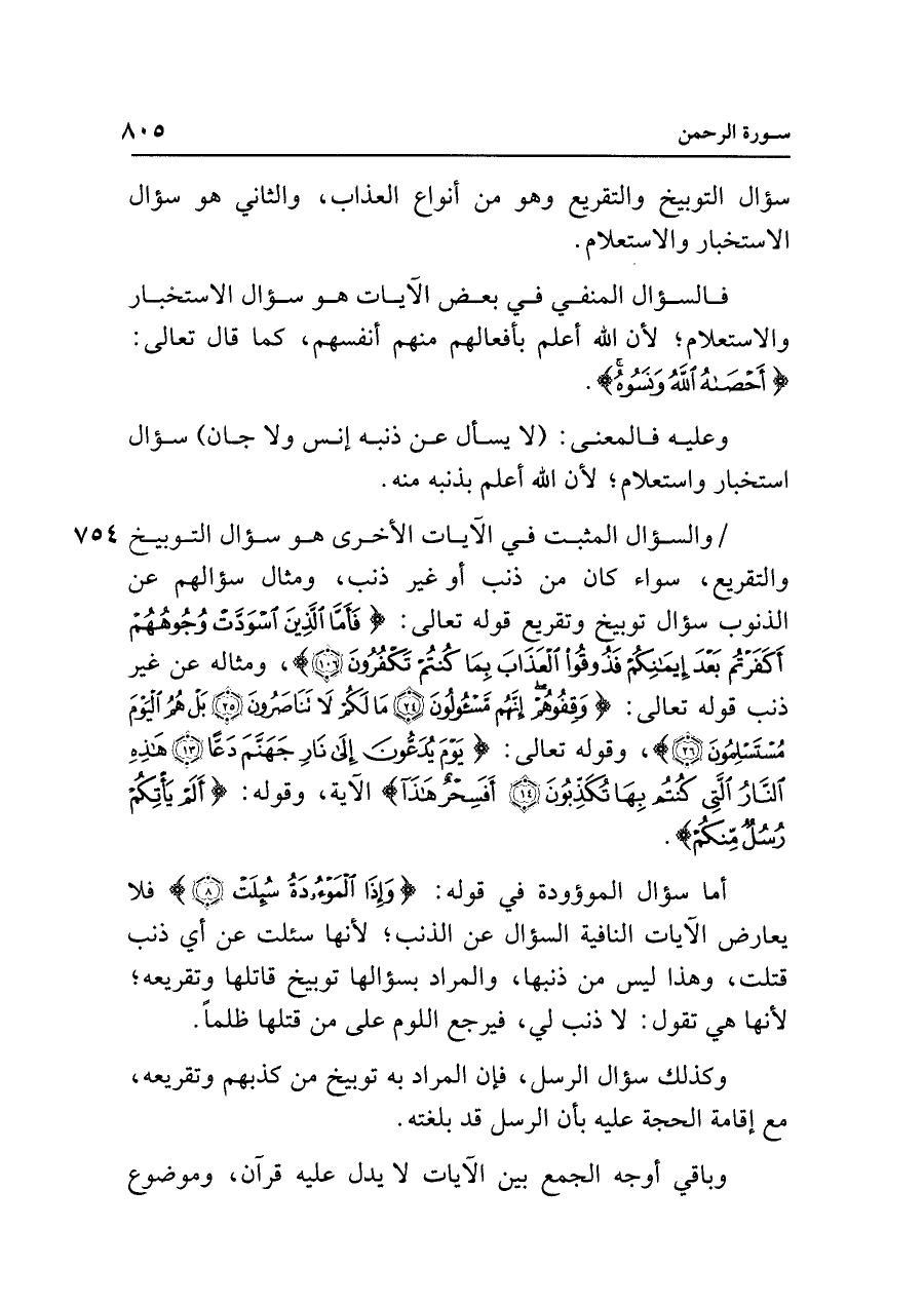 والسؤال المثبت في الآيات الأخرى هو سؤال التوبيخ والتقريع، سواء كان من ذنب أو غير ذنب، ومثال سؤالهم عن الذنوب سؤال توبيخ وتقريع قوله تعالى: {فَأَمَّا الَّذِينَ اسْوَدَّتْ وُجُوهُهُمْ أَكَفَرْتُمْ بَعْدَ إِيمَانِكُمْ فَذُوقُوا الْعَذَابَ بِمَا كُنْتُمْ تَكْفُرُونَ (١٠٦)}، ومثاله عن غير ذنب قوله تعالى: {وَقِفُوهُمْ إِنَّهُمْ مَسْئُولُونَ (٢٤) مَا لَكُمْ لَا تَنَاصَرُونَ (٢٥) بَلْ هُمُ الْيَوْمَ مُسْتَسْلِمُونَ (٢٦)}، وقوله تعالى: {يَوْمَ يُدَعُّونَ إِلَى نَارِ جَهَنَّمَ دَعًّا (١٣) هَذِهِ النَّارُ الَّتِي كُنْتُمْ بِهَا تُكَذِّبُونَ (١٤) أَفَسِحْرٌ هَذَا} الآية، وقوله: {أَلَمْ يَأْتِكُمْ رُسُلٌ مِنْكُمْ}.