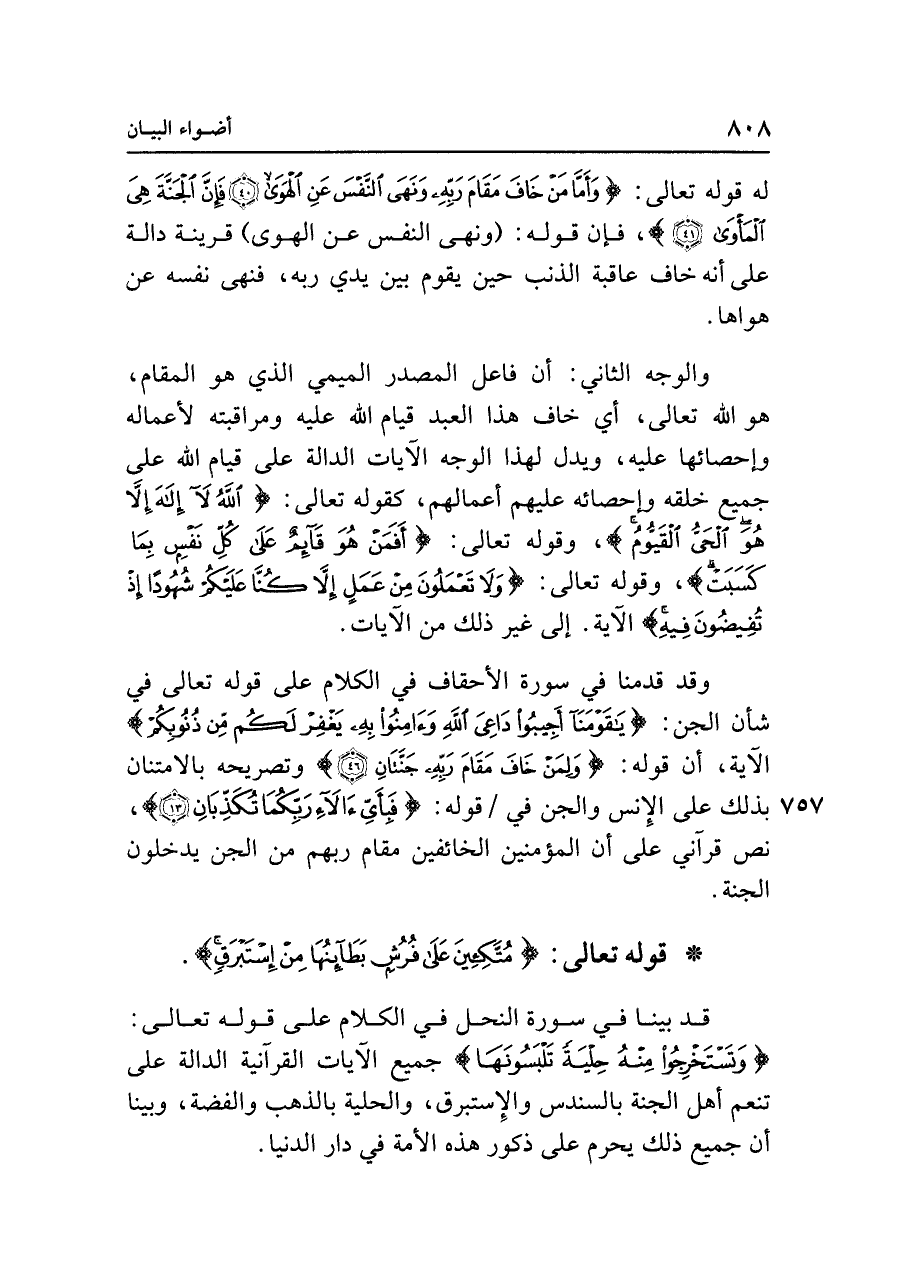 والوجه الثاني: أن فاعل المصدر الميمي الذي هو المقام، هو الله تعالى، أي خاف هذا العبد قيام الله عليه ومراقبته لأعماله وإحصائها عليه، ويدل لهذا الوجه الآيات الدالة على قيام الله على جميع خلقه وإحصائه عليهم أعمالهم، كقوله تعالى: {اللَّهُ لَا إِلَهَ إلا هُوَ الْحَيُّ الْقَيُّومُ (٢)}، وقوله تعالى: {أَفَمَنْ هُوَ قَائِمٌ عَلَى كُلِّ نَفْسٍ بِمَا كَسَبَتْ}، وقوله تعالى: {وَلَا تَعْمَلُونَ مِنْ عَمَلٍ إلا كُنَّا عَلَيكُمْ شُهُودًا إِذْ تُفِيضُونَ فِيهِ} الآية. إلى غير ذلك من الآيات.