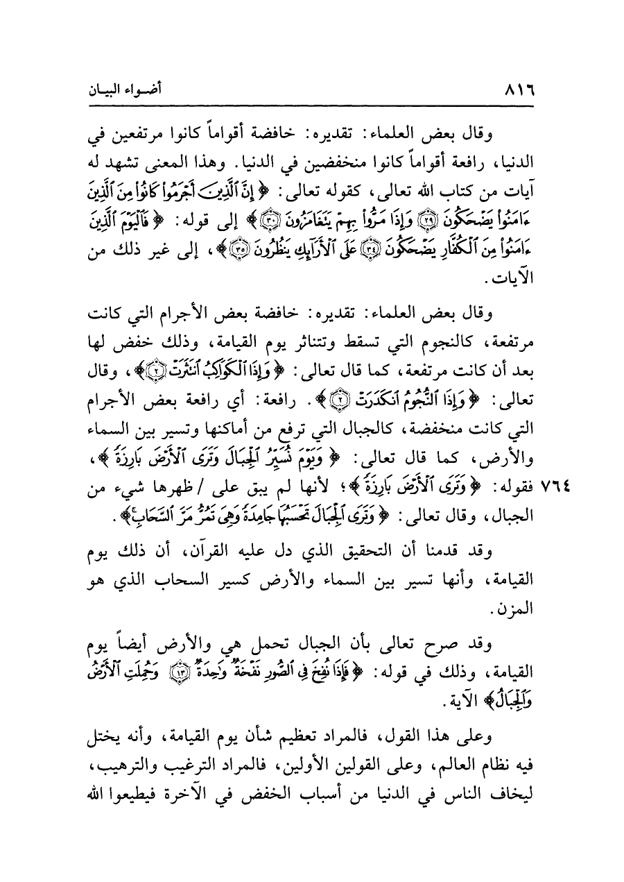 وقال بعض العلماء: تقديره: خافضة أقوامًا كانوا مرتفعين في الدنيا، رافعة أقوامًا كانوا منخفضين في الدنيا. وهذا المعنى تشهد له آيات من كتاب الله تعالى، كقوله تعالى: {إِنَّ الَّذِينَ أَجْرَمُوا كَانُوا مِنَ الَّذِينَ آمَنُوا يَضْحَكُونَ (٢٩) وَإِذَا مَرُّوا بِهِمْ يَتَغَامَزُونَ (٣٠)} إلى قوله: {فَالْيَوْمَ الَّذِينَ آمَنُوا مِنَ الْكُفَّارِ يَضْحَكُونَ (٣٤) عَلَى الْأَرَائِكِ يَنْظُرُونَ (٣٥)}، إلى غير ذلك من الآيات.