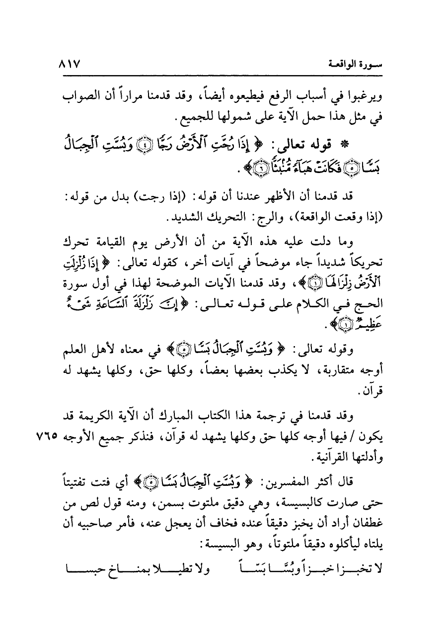 • قوله تعالى: {إِذَا رُجَّتِ الْأَرْضُ رَجًّا (٤) وَبُسَّتِ الْجِبَالُ بَسًّا (٥) فَكَانَتْ هَبَاءً مُنْبَثًّا (٦)}.