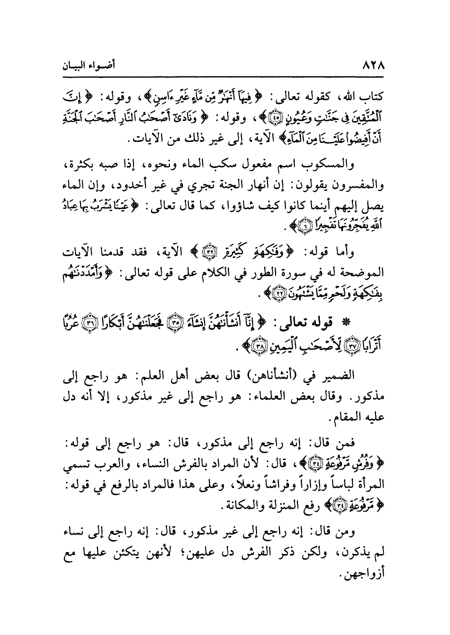 فمن قال: إنه راجع إلى مذكور، قال: هو راجع إلى قوله: {وَفُرُشٍ مَرْفُوعَةٍ (٣٤)}، قال: لأن المراد بالفرش النساء، والعرب تسمي المرأة لباسًا وإزارًا وفراشًا ونعلًا، وعلى هذا فالمراد بالرفع في قوله: {مَرْفُوعَةٍ (٣٤)} رفع المنزلة والمكانة.