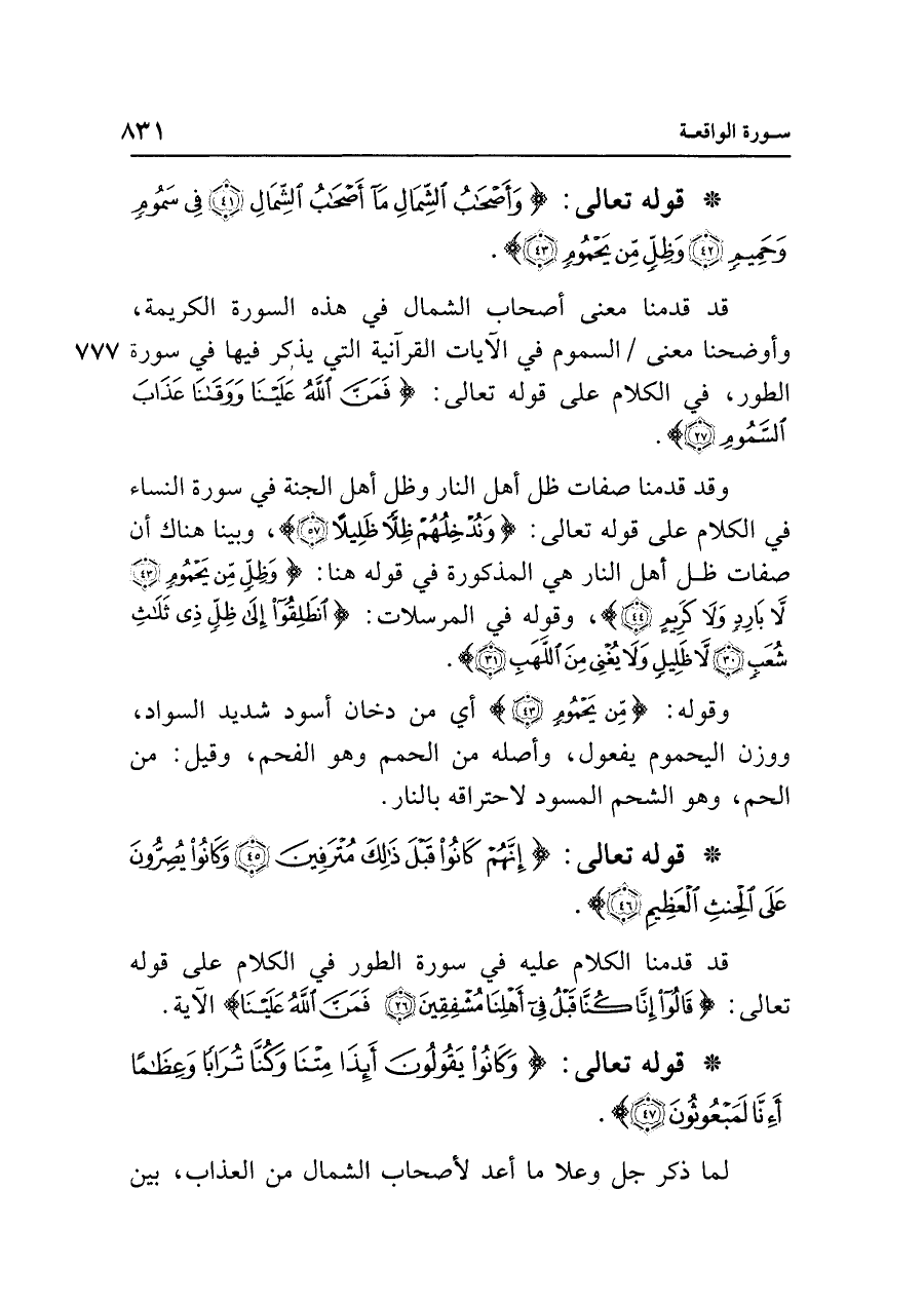 قد قدمنا معنى أصحاب الشمال في هذه السورة الكريمة، وأوضحنا معنى السموم في الآيات القرآنية التي يذكر فيها في سورة الطور، في الكلام على قوله تعالى: {فَمَنَّ اللَّهُ عَلَينَا وَوَقَانَا عَذَابَ السَّمُومِ (٢٧)}.