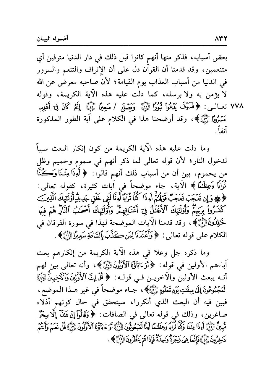 وما دلت عليه هذه الآية الكريمة من كون إنكار البعث سببًا لدخول النار؛ لأن قوله تعالى لما ذكر أنهم في سموم وحميم وظل من يحموم، بين أن من أسباب ذلك أنهم قالوا: {أَإِذَا مِتْنَا وَكُنَّا تُرَابًا وَعِظَامًا} الآية، جاء موضحًا في آيات كثيرة، كقوله تعالى: {وَإِنْ تَعْجَبْ فَعَجَبٌ قَوْلُهُمْ أَإِذَا كُنَّا تُرَابًا أَإِنَّا لَفِي خَلْقٍ جَدِيدٍ أُولَئِكَ الَّذِينَ كَفَرُوا بِرَبِّهِمْ وَأُولَئِكَ الْأَغْلَالُ فِي أَعْنَاقِهِمْ وَأُولَئِكَ أَصْحَابُ النَّارِ هُمْ فِيهَا خَالِدُونَ (٥)}، وقد قدمنا الآيات الموضحة لهذا في سورة الفرقان في الكلام على قوله تعالى: {وَأَعْتَدْنَا لِمَنْ كَذَّبَ بِالسَّاعَةِ سَعِيرًا (١١)}.