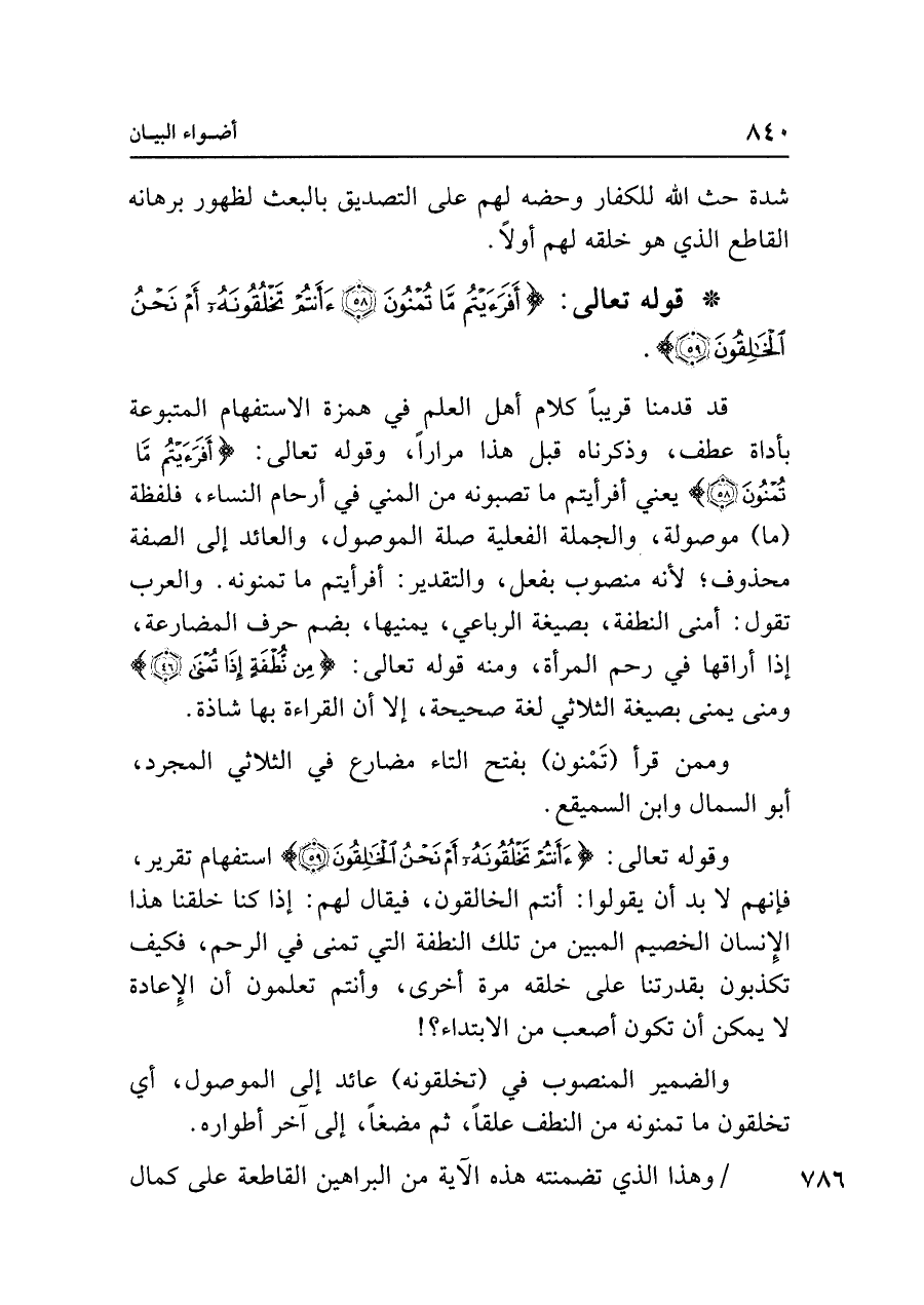قد قدمنا قريبًا كلام أهل العلم في همزة الاستفهام المتبوعة بأداة عطف، وذكرناه قبل هذا مرارًا، وقوله تعالى: {أَفَرَأَيتُمْ مَا تُمْنُونَ (٥٨)} يعني أفرأيتم ما تصبونه من المني في أرحام النساء، فلفظة (ما) موصولة، والجملة الفعلية صلة الموصول، والعائد إلى الصفة محذوف؛ لأنه منصوب بفعل، والتقدير: أفرأيتم ما تمنونه. والعرب تقول: أمنى النطفة، بصيغة الرباعي، يمنيها، بضم حرف المضارعة، إذا أراقها في رحم المرأة، ومنه قوله تعالى: {مِنْ نُطْفَةٍ إِذَا تُمْنَى (٤٦)} ومنى يمنى بصيغة الثلاثي لغة صحيحة، إلا أن القراءة بها شاذة.
