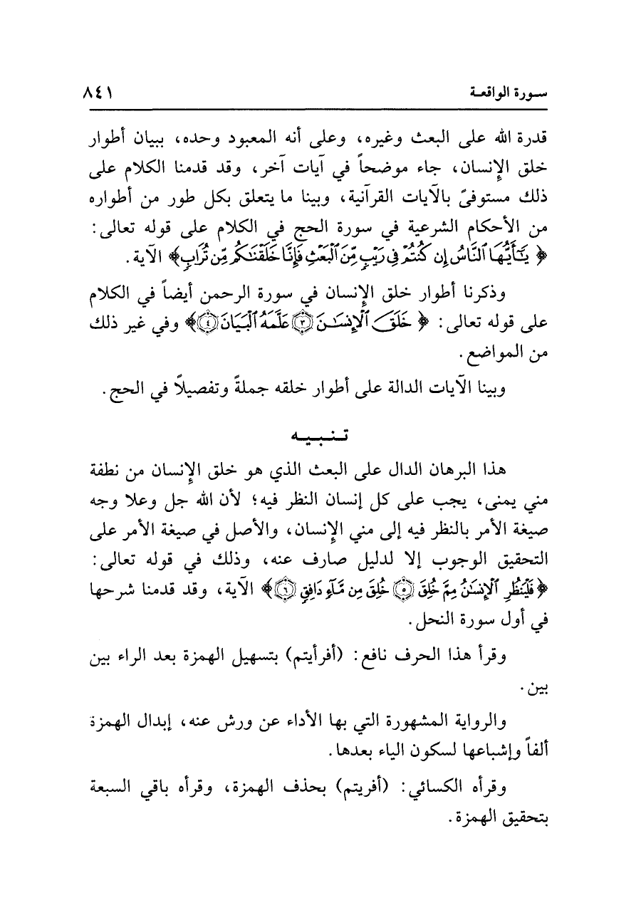 هذا البرهان الدال على البعث الذي هو خلق الإِنسان من نطفة مني يمنى، يجب على كل إنسان النظر فيه؛ لأن الله جل وعلا وجه صيغة الأمر بالنظر فيه إلى مني الإِنسان، والأصل في صيغة الأمر على التحقيق الوجوب إلا لدليل صارف عنه، وذلك في قوله تعالى: {فَلْيَنْظُرِ الْإِنْسَانُ مِمَّ خُلِقَ (٥) خُلِقَ مِنْ مَاءٍ دَافِقٍ (٦)} الآية، وقد قدمنا شرحها في أول سورة النحل.