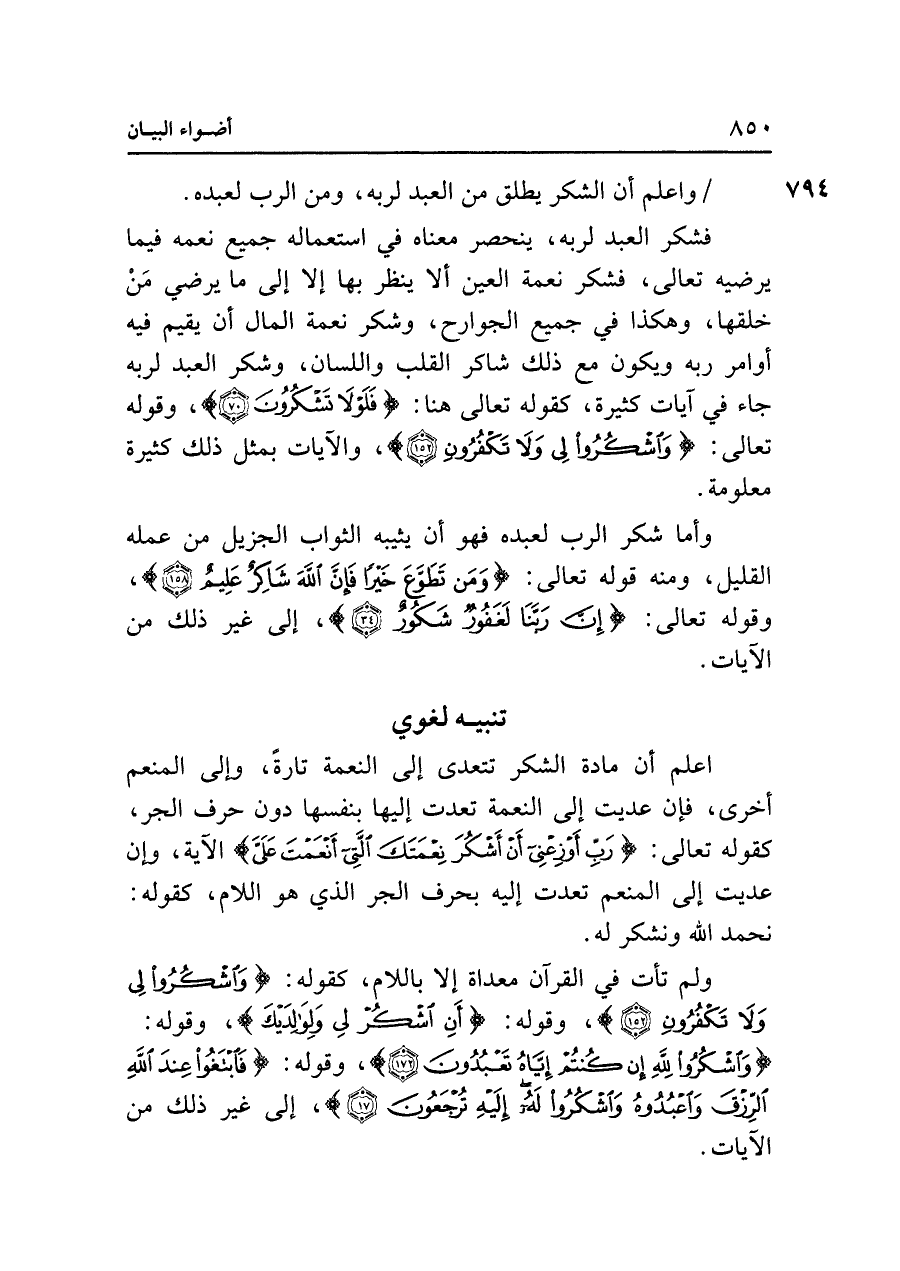 اعلم أن مادة الشكر تتعدى إلى النعمة تارةً، وإلى المنعم أخرى، فإن عديت إلى النعمة تعدت إليها بنفسها دون حرف الجر، كقوله تعالى: {رَبِّ أَوْزِعْنِي أَنْ أَشْكُرَ نِعْمَتَكَ الَّتِي أَنْعَمْتَ عَلَيَّ} الآية، وإن عديت إلى المنعم تعدت إليه بحرف الجر الذي هو اللام، كقوله: نحمد الله ونشكر له.