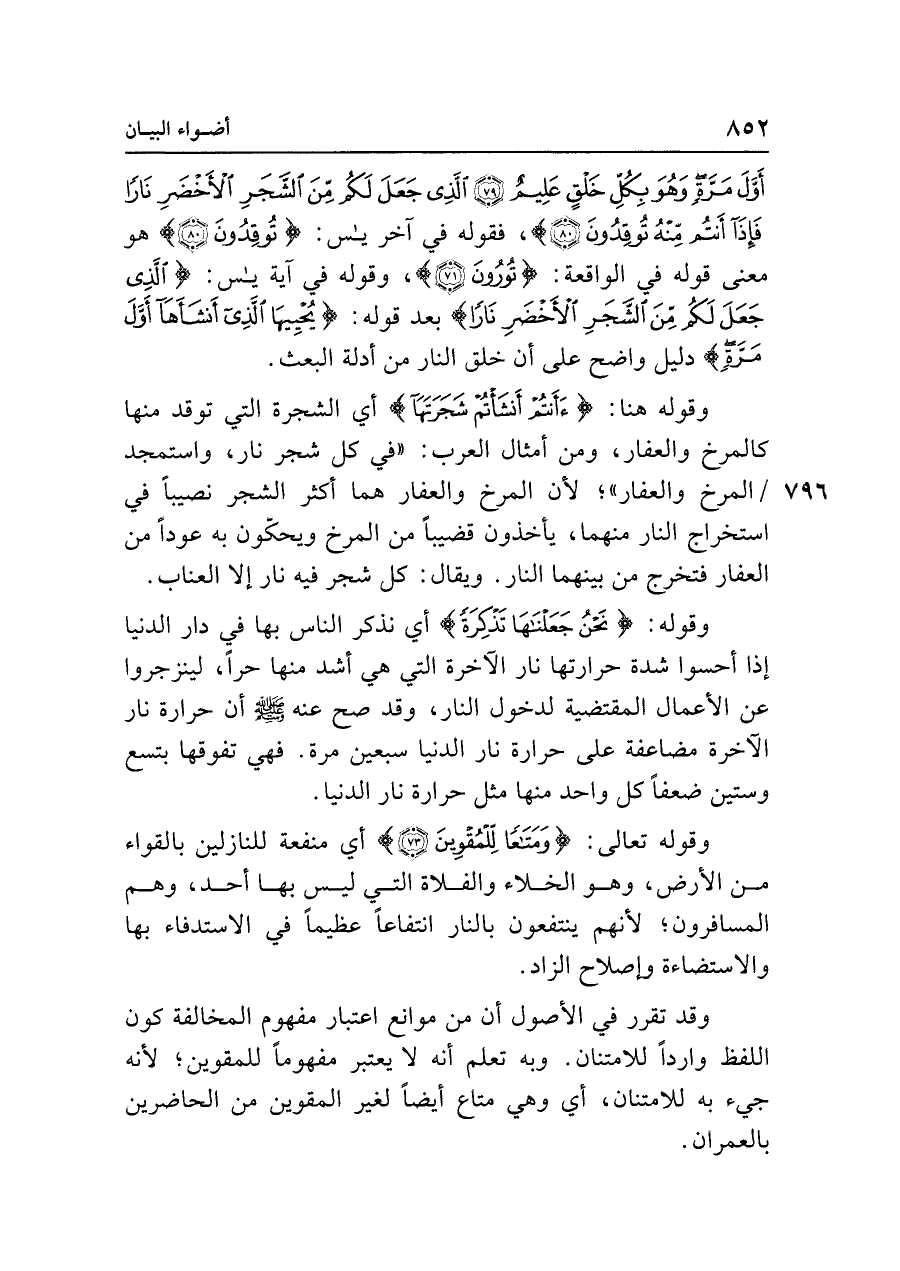 أَوَّلَ مَرَّةٍ وَهُوَ بِكُلِّ خَلْقٍ عَلِيمٌ (٧٩) الَّذِي جَعَلَ لَكُمْ مِنَ الشَّجَرِ الْأَخْضَرِ نَارًا فَإِذَا أَنْتُمْ مِنْهُ تُوقِدُونَ (٨٠)}، فقوله في آخر يس: {تُوقِدُونَ (٨٠)}، معنى قوله في الواقعة: {تُورُونَ (٧١)} وقوله في آية يس: {جَعَلَ لَكُمْ مِنَ الشَّجَرِ الْأَخْضَرِ نَارًا} بعد قوله: {يُحْيِيهَا الَّذِي أَنْشَأَهَا أَوَّلَ مَرَّةٍ} دليل واضح على أن خلق النار من أدلة البعث.
