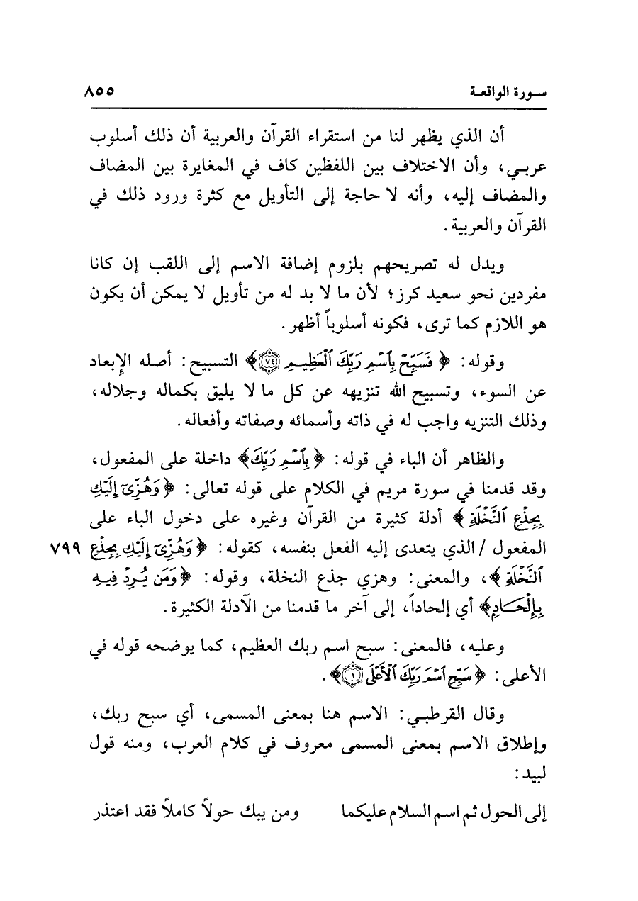 وعليه، فالمعنى: سبح اسم ربك العظيم، كما يوضحه قوله في الأعلى: {سَبِّحِ اسْمَ رَبِّكَ الْأَعْلَى (١)}.