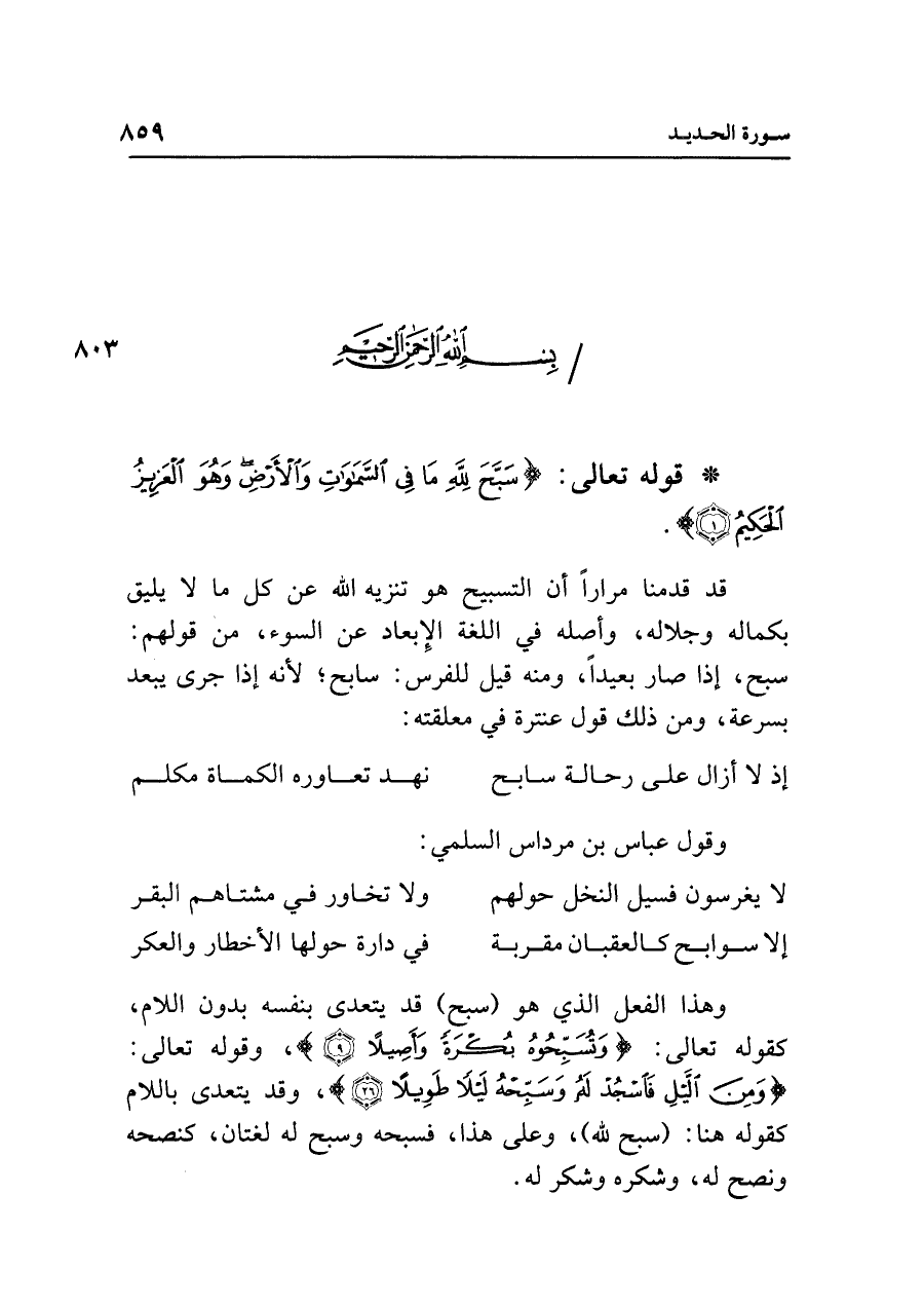• قوله تعالى: {سَبَّحَ لِلَّهِ مَا فِي السَّمَاوَاتِ وَالْأَرْضِ وَهُوَ الْعَزِيزُ الْحَكِيمُ (١)}.