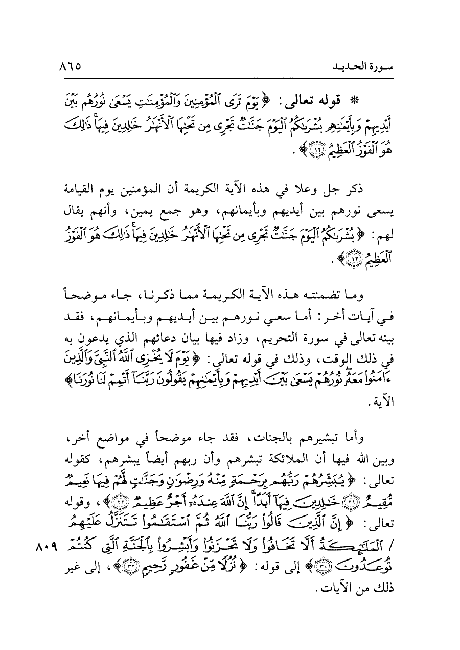 • قوله تعالى: {يَوْمَ تَرَى الْمُؤْمِنِينَ وَالْمُؤْمِنَاتِ يَسْعَى نُورُهُمْ بَينَ أَيدِيهِمْ وَبِأَيمَانِهِمْ بُشْرَاكُمُ الْيَوْمَ جَنَّاتٌ تَجْرِي مِنْ تَحْتِهَا الْأَنْهَارُ خَالِدِينَ فِيهَا ذَلِكَ هُوَ الْفَوْزُ الْعَظِيمُ (١٢)}.
