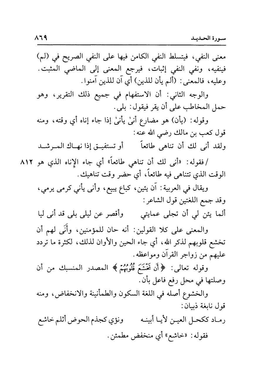 معنى النفي، فيتسلط النفي الكامن فيها على النفي الصريح في (لم) فينفيه، ونفي النفي إثبات، فيرجع المعنى إلى الماضي المثبت. وعليه، فالمعنى: (ألم يأن للذين) أي آن للذين آمنوا.