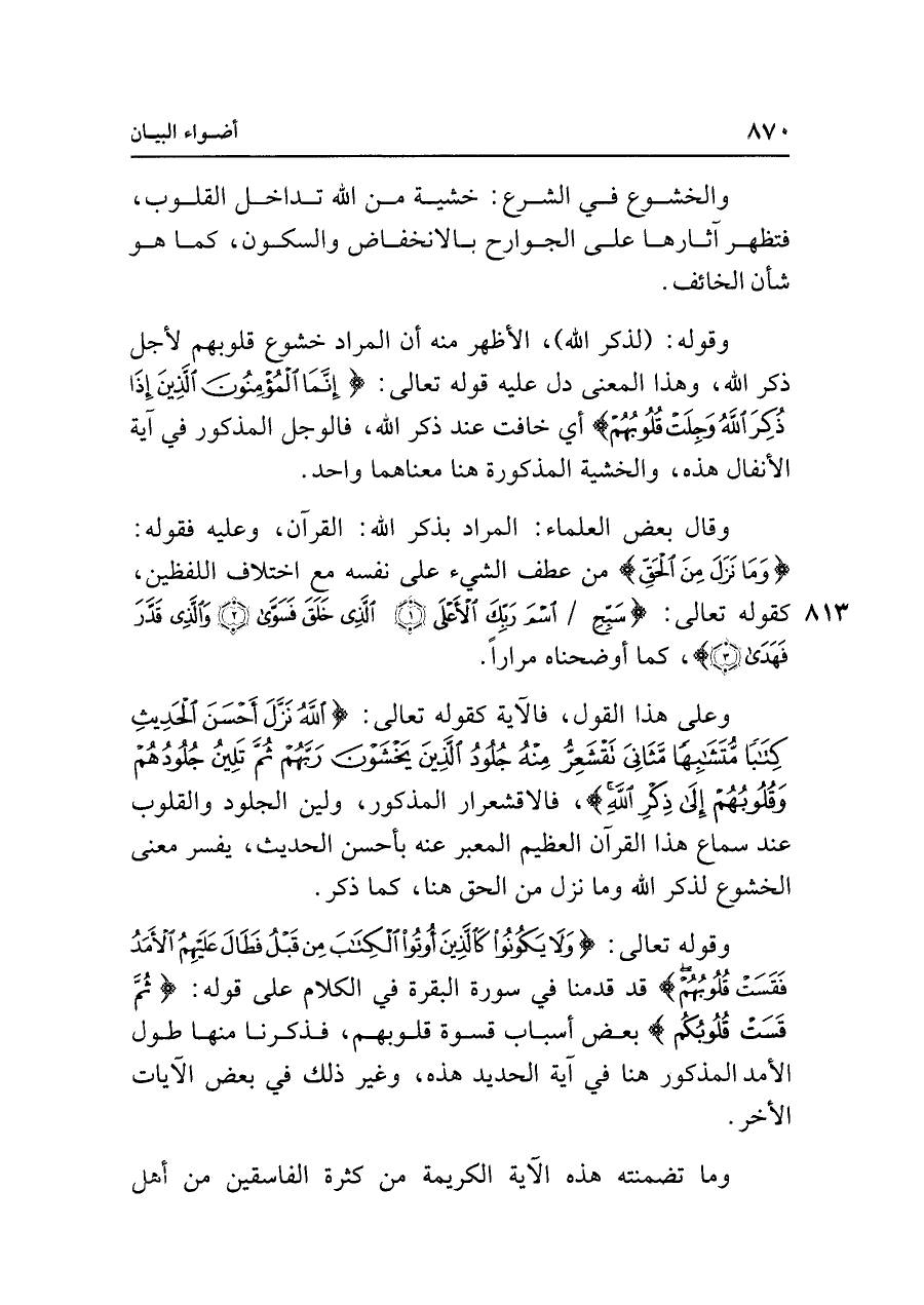 وقوله: (لذكر الله)، الأظهر منه أن المراد خشوع قلوبهم لأجل ذكر الله، وهذا المعنى دل عليه قوله تعالى: {إِنَّمَا الْمُؤْمِنُونَ الَّذِينَ إِذَا ذُكِرَ اللَّهُ وَجِلَتْ قُلُوبُهُمْ} أي خافت عند ذكر الله، فالوجل المذكور في آية الأنفال هذه، والخشية المذكورة هنا معناهما واحد.