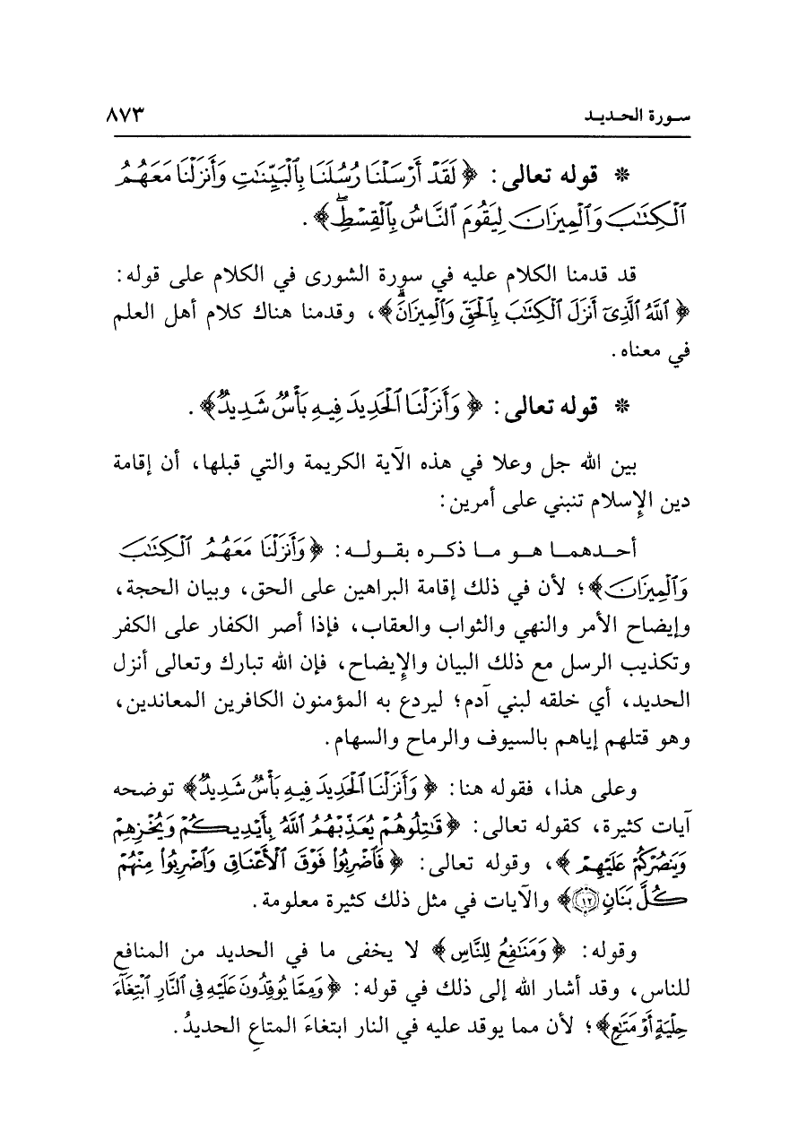 وعلى هذا، فقوله هنا: {وَأَنْزَلْنَا الْحَدِيدَ فِيهِ بَأْسٌ شَدِيدٌ} توضحه آيات كثيرة، كقوله تعالى: {قَاتِلُوهُمْ يُعَذِّبْهُمُ اللَّهُ بِأَيدِيكُمْ وَيُخْزِهِمْ وَيَنْصُرْكُمْ عَلَيهِمْ}، وقوله تعالى: {فَاضْرِبُوا فَوْقَ الْأَعْنَاقِ وَاضْرِبُوا مِنْهُمْ كُلَّ بَنَانٍ (١٢)} والآيات في مثل ذلك كثيرة معلومة.